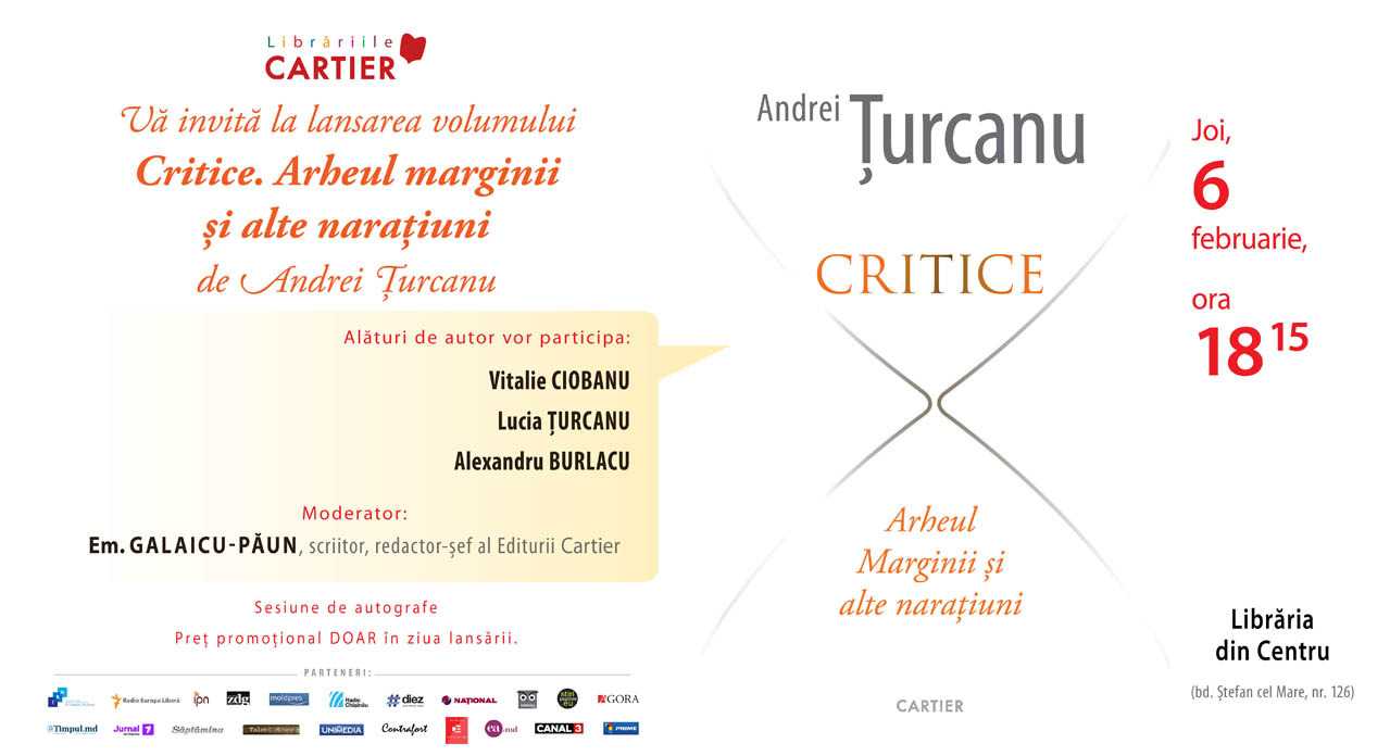Joi, 6 februarie 2020, la ora 18.15, la Librăria din Centru (bd. Ștefan cel Mare, nr.126) din Chișinău, va avea loc lansarea volumului Critice. Arheul Marginii și alte narațiuni, apărut la Editura Cartier în colecția Rotonda, coordonată de Emilian Galaicu-Păun. Alături de autor vor participa: Vitalie Ciobanu, Lucia Țurcanu, Alexandru Burlacu. Moderator: Emilian Galaicu-Păun.
