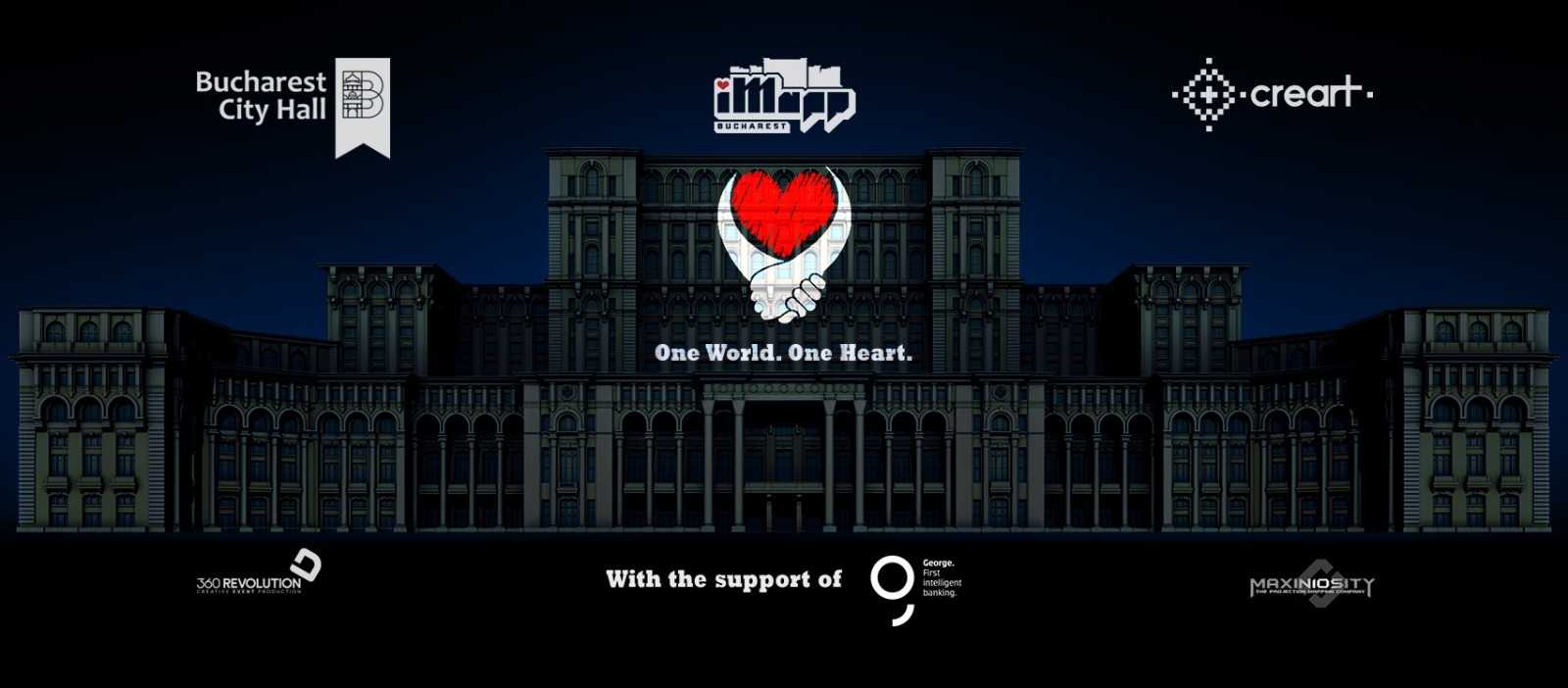 Sub deviza „One World. One Heart”, iMapp Bucharest, unul dintre cele mai importante concursuri de video mapping din lume (liantul unui circuit internațional al artelor vizuale), organizat de Primăria Capitalei, prin creart – Centrul de Creație, Artă și Tradiție al Municipiului București, a lansat o inițiativă artistică prin care se aduce un mesaj de solidaritate și speranță la nivel mondial, în contextul internațional actual al pandemiei de COVID – 19, care a generat distanțarea socială ca măsură necesară de prevenire. Proiectul de conștientizare publică a susținerii reciproce – „One World. One Heart”, implementat prin intermediul artelor vizuale la nivel internațional, a fost realizat pro bono de artiștii implicați și susținut tehnic și logistic de parteneri, fără costuri din bugetul Primăriei Capitalei sau din al Creart. Astfel, 46 de artiști internaționali din domeniul audiovizual au fost invitați să creeze animații 3D cu o durată de 10 secunde, pornind de la același element – o inimă, întărind, prin forța creativă, mesajul campaniei de solidaritate la nivel internațional. Lucrările au fost reunite într-un singur video, care va fi proiectat simultan pe fațadele unor clădiri din întreaga lume, respectiv din București (România), Budapesta (Ungaria), Seattle (S.U.A.), Monterrey (Mexic). În București, aceste lucrări vor fi proiectate pe fațada Palatului Parlamentului, vineri, 17 aprilie 2020, la ora 22:00, și vor fi prezentate publicului, online, pe pagina de Facebook iMapp Bucharest – printr-un live streaming (www.facebook.com/iMappBucharest).