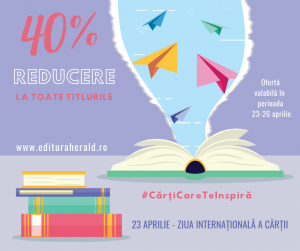 Pentru că pe 23 aprilie, în toată lumea se serbează Ziua Internațională a Cărții, editura Herald nu ratează nici un prilej de a sărbători și încuraja lectura! În perioada 23-26 aprilie 2020 pe site-ul editurii  ai posibilitatea de a achiziționa toate cărțile preferate cu o reducere de 40%.