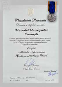 Muzeul Municipiului București a primit recent Medalia Aniversară „Centenarul Marii Uniri”. Distincția a fost acordată „pentru efortul depus în vederea păstrării identității naționale și a răspândirii valorilor culturale românești, pentru dăruirea cu care s-a implicat în organizarea de evenimente dedicate Centenarului Marii Uniri”. Munca susținută dedicată Centenarului, care a fost astfel remarcată și evidențiată prin decernarea acestei medalii aniversare, s-a reflectat în concretizarea unui program complex care a inclus realizarea unor expoziții, emisiuni filatelice, proiecte de cercetare, conferințe publice, filme documentare și lansarea unor proiecte editoriale.