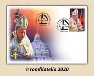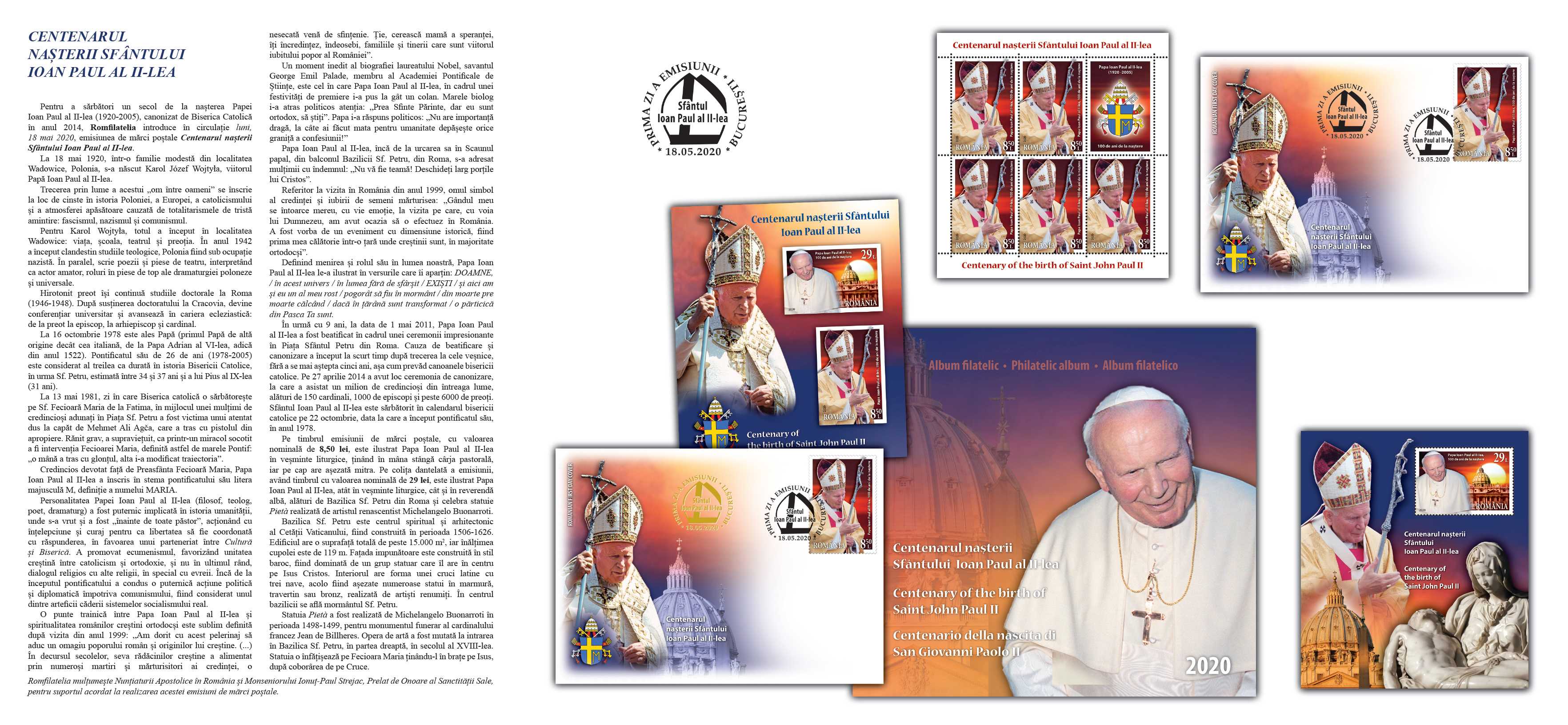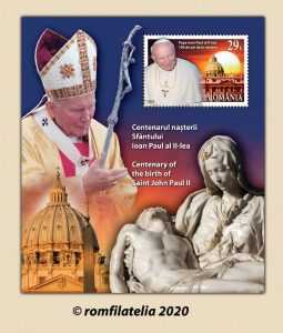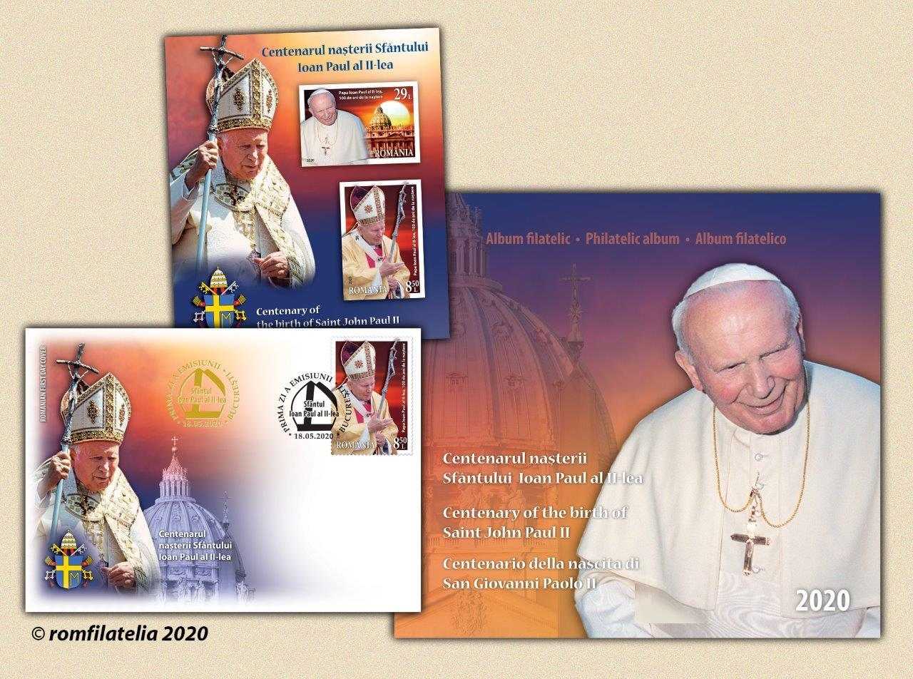 Pentru a sărbători un secol de la nașterea Papei Ioan Paul al II-lea (1920-2005), canonizat de Biserica Catolică în anul 2014, Romfilatelia introduce în circulație luni, 18 mai 2020, emisiunea de mărci poștale Centenarul nașterii Sfântului Ioan Paul al II-lea. La 18 mai 1920, într-o familie modestă din localitatea Wadowice, Polonia, s-a născut Karol Józef Wojtyła, viitorul Papă Ioan Paul al II-lea. Trecerea prin lume a acestui „om între oameni” se înscrie la loc de cinste în istoria Poloniei, a Europei, a catolicismului și a atmosferei apăsătoare cauzată de totalitarismele de tristă amintire: fascismul, nazismul și comunismul.