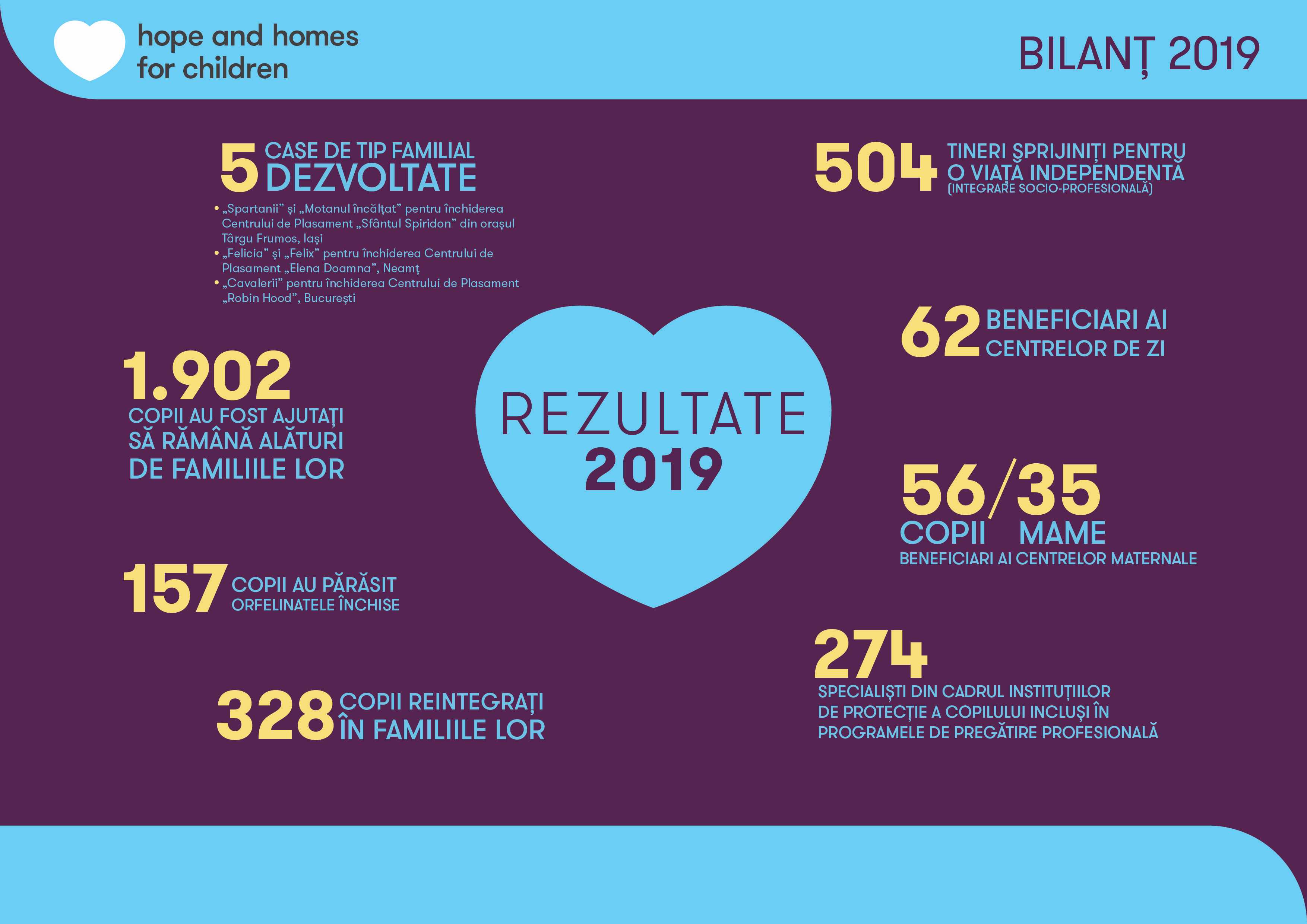 În 2019, Fundația a închis Centrul de Plasament „Sfântul Spiridon” din Târgu Frumos, jud. Iași, a deschis 5 case de tip familial în 3 județe, a prevenit separarea de familie a 1.902 copii, a sprijinit în primii pași spre viață independentă 504 tineri de peste 18 ani după ieșirea din centre de plasament, și a adus înapoi acasă 328 de copii ce fuseseră anterior în plasamentul Statului.  Pe parcursul anului, Fundația a lucrat la închiderea altor 15 centre de plasament din 8 județe și București. Adăugând rezultatele anului 2019 la cele înregistrate în 22 de ani de activitate în România, Fundația a îmbunătățit, până în prezent, viața a 57.000 de copii din medii vulnerabile.