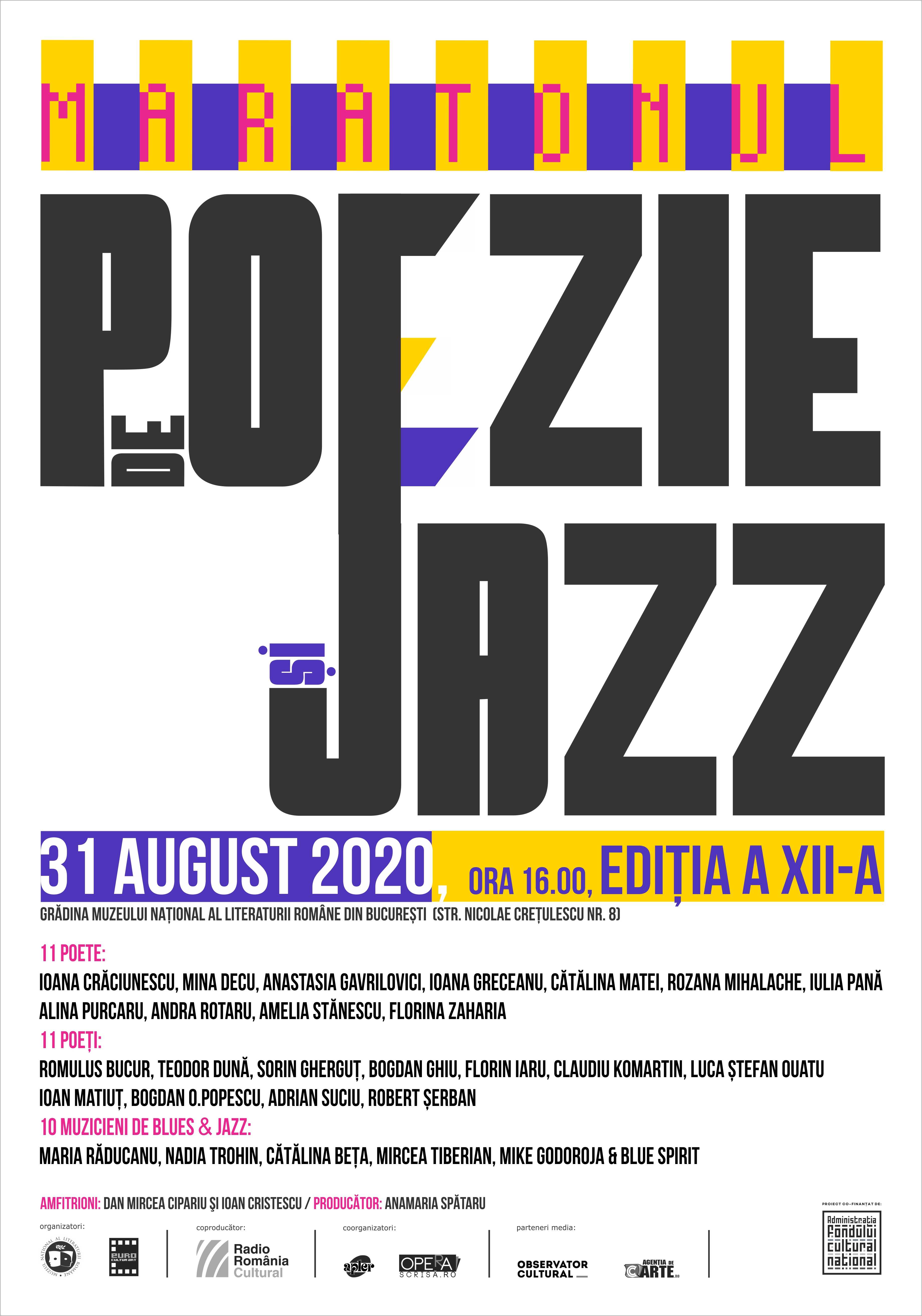 Luni, 31 august 2020, de Ziua Limbii Române, între orele 16.00-19.00, în grădina Muzeului Național al Literaturii Române din București (str. Nicolae Crețulescu nr. 8), va avea loc Maratonul de Poezie și Jazz, ediția a XII-a, difuzat în direct de Radio România Cultural. 22 de nume importante din generaţii şi geografii literare diferite vor susține lecturi publice de câte 5 minute. Sunt invitate 11 poete: Ioana Crăciunescu, Mina Decu, Anastasia Gavrilovici, Ioana Greceanu, Cătălina Matei, Rozana Mihalache, Iulia Pană, Alina Purcaru, Andra Rotaru, Amelia Stănescu și Florina Zaharia. Sunt invitați 11 poeți: Romulus Bucur, Teodor Dună, Sorin Gherguț, Bogdan Ghiu, Florin Iaru, Claudiu Komartin, Luca Ștefan Ouatu, Ioan Matiuț, Bogdan O. Popescu, Adrian Suciu și Robert Șerban. Vor susține recitaluri câteva dintre cele mai importante și mai autentice nume ale blues-ului și jazz-ului contemporan românesc: Maria Răducanu, Nadia Trohin, Cătălina Beța, Mircea Tiberian și Mike Godoroja & Blue Spirit. Amfitrionii Maratonului sunt Dan Mircea Cipariu și Ioan Cristescu. Art director: Mihai Zgondoiu. Producător: Anamaria Spătaru. Organizatorii Maratonului de Poezie și Jazz sunt Primăria Municipiului București prin Muzeul Național al Literaturii Române din București și asociația Euro CulturArt. Coproducător: Radio România Cultural. Proiect cofinanțat de AFCN (Administrația Fondului Cultural Național).