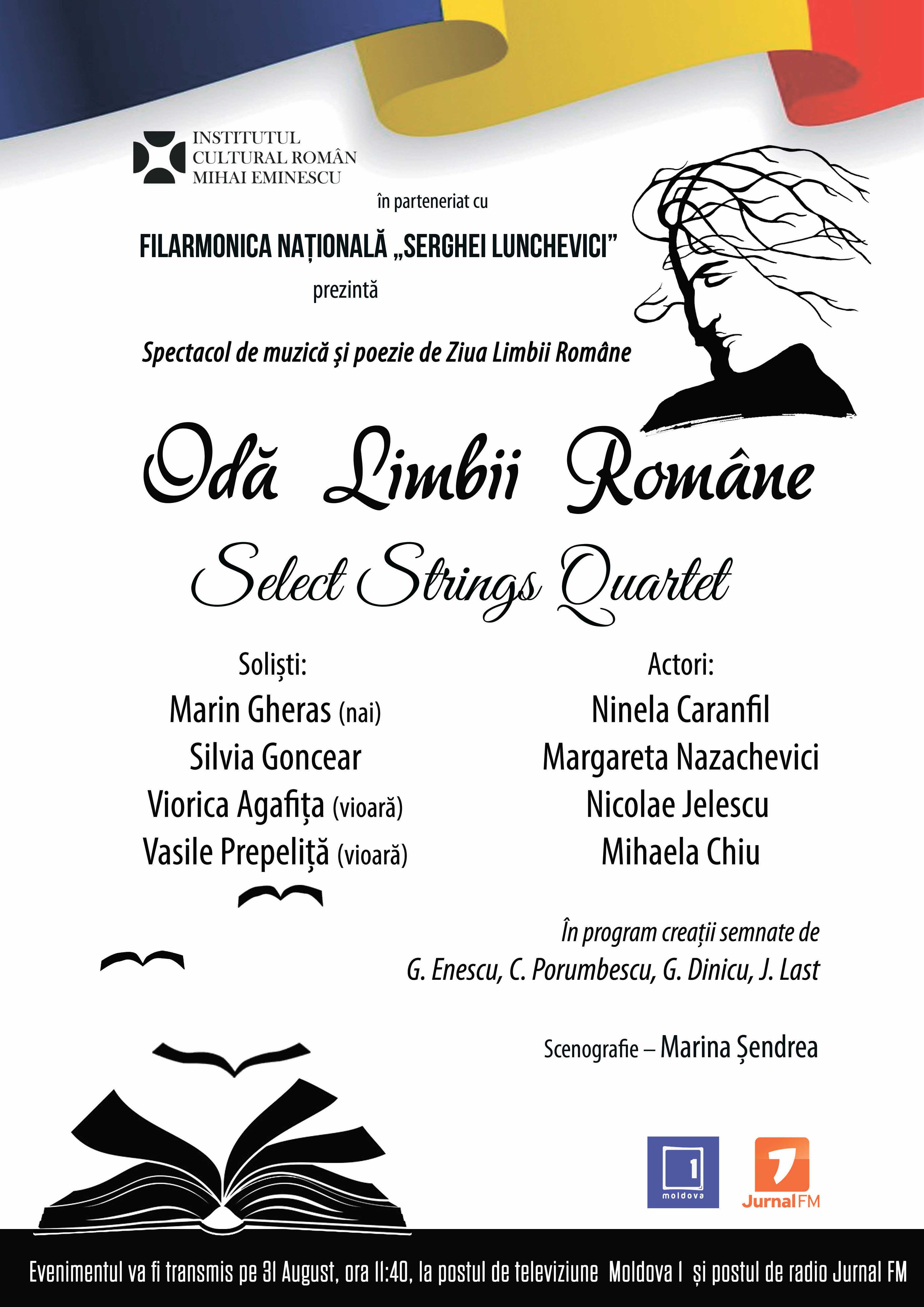 Artiști îndrăgiți de peste Prut se vor reuni luni, 31 august, de la ora 11.00, într-un spectacol ce împletește armonios muzica și poezia, pentru a marca Ziua Limbii Române. Sub genericul „Odă limbii române”, Institutul Cultural Român „Mihai Eminescu” de la Chișinău va transmite, pe pagina de Facebook, un recital de poezie susținut de actorii Nicolae Jelescu, Margareta Nazarchevici, Ninela Caranfil, Mihaela Chiu.De asemenea, Silvia Goncear,Marin Gherașși Select Stings Quartet vor susține momentele muzicale ale evenimentului.