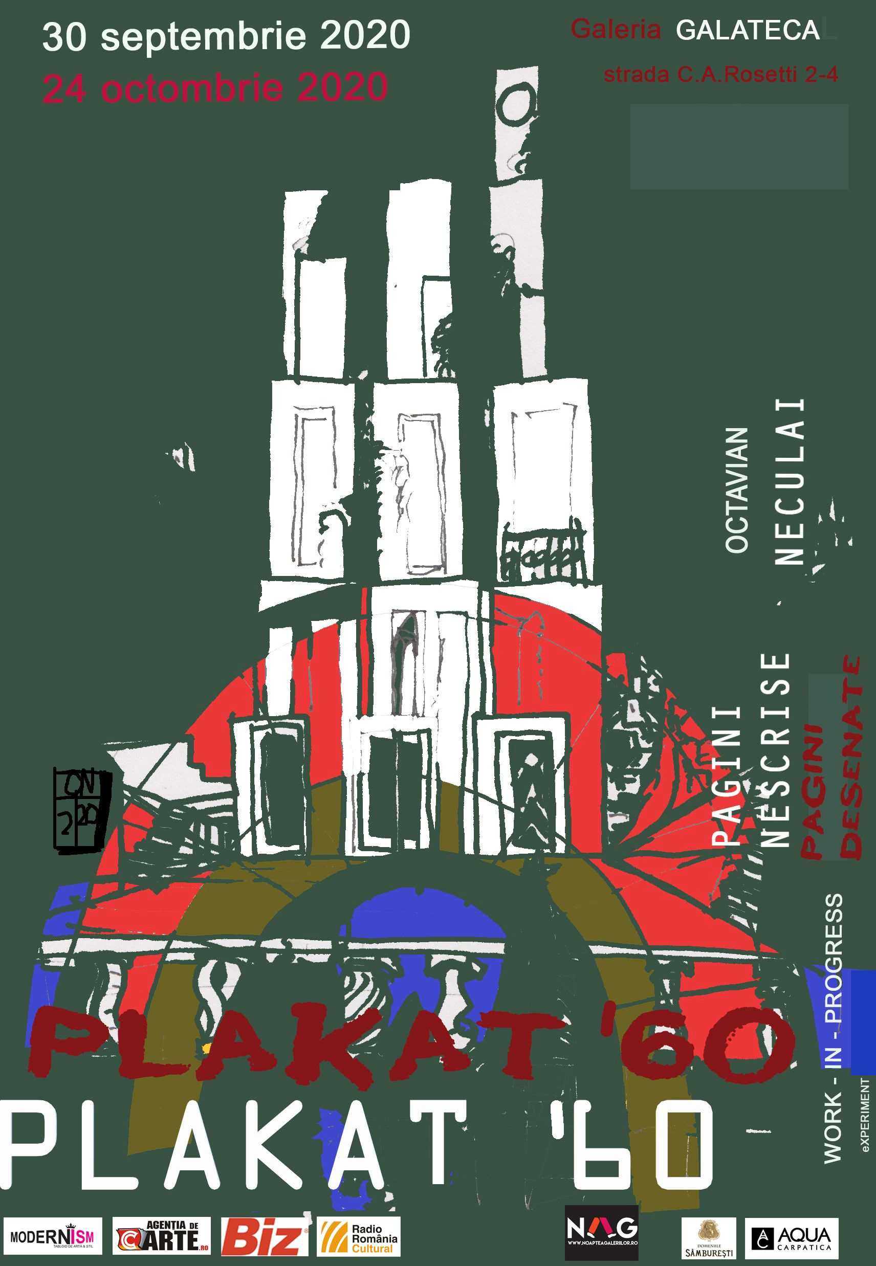 În vremea pandemiei Octavian Neculai propune un experiment de gânduri exprimate prin desene; un prilej de a vedea cum poate arăta o expoziție unde o cameră video urmărește desenele expuse și detaliile lor. Plakat ’60 e dezvoltarea unei probleme a contactului între simțiri, amintiri, imagini refăcute si iubirea de aproapele nostru sau chiar față de noi înșine. Galateca vernisează miercuri, 30 septembrie 2020, expoziția Plakat ’60, a doua creată de scenograful Octavian Neculai în spațiul galeriei, imaginată sub forma unei instalații de desene, decupate în sensul ideilor conținute în ele.