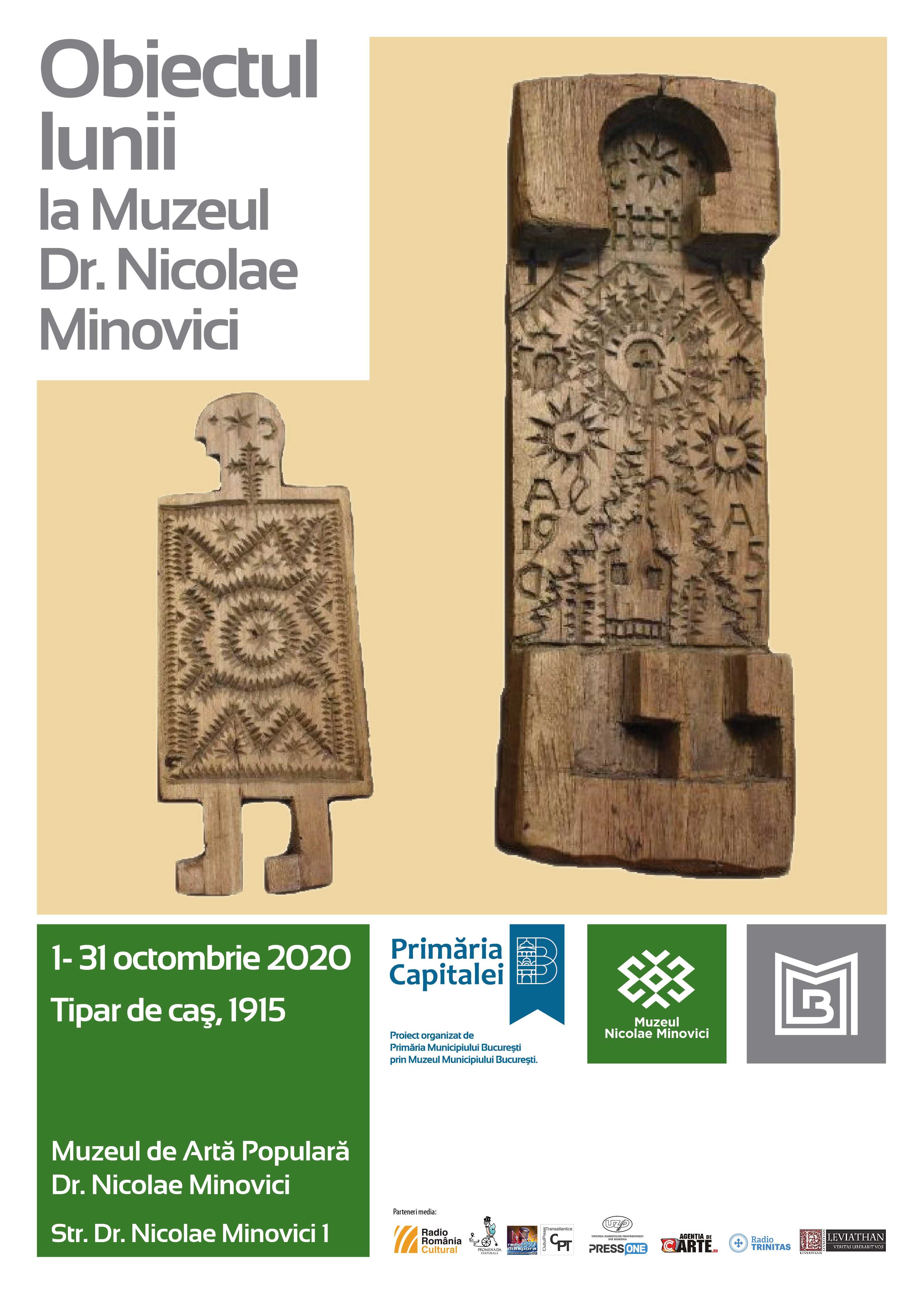 Muzeul Municipiului București vă invită la Muzeul de Artă Populară Dr. Nicolae Minovici pentru a descoperi obiectul lunii octombrie, un obiect tradițional care a ocupat un loc important în arta lemnului la români. Artefactul propus de Muzeul Dr. Nicolae Minovici – tiparul de caș – era folosit în secolul XIX în mediul pastoral. Tiparul de caș poate fi confecționat din lemn de paltin, carpen, tei sau fag și este întâlnit în zonele pastorale din Moldova (îndeosebi în Vrancea), în zona Branului și în Muscel. Aceste piese pastorale se întâlneau în zonele în care păstoritul se practica intens. Din punct de vedere al formei, tiparele de caș se împart în două categorii: dreptunghiulare – compuse din două plăci care se suprapun una peste alta, și rotunde – cu o singură față, înconjurată cu o ramă subțire de lemn.