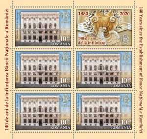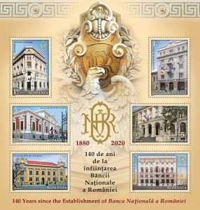 Aniversarea Băncii Naționale a României oferă societății Romfilatelia prilejul de a introduce în circulație emisiunea de mărci poştale 140 de ani de la înființarea Băncii Naționale a României. Emisiunea, alcătuită din șase timbre, o coliță nedantelată și un bloc filatelic, ce ilustrează Palatul Nou al BNR și clădirile sucursalelor teritoriale, va intra în circulație miercuri, 21 octombrie 2020.