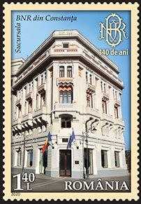 Timbrul cu valoarea nominală de 1,40 lei reproduce arhitectura clădirii Sucursalei BNR din orașul Constanța.