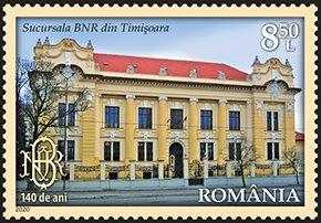 Pe timbrul cu valoarea nominală de 8,50 lei este reprodusă clădirea Sucursalei BNR din Timișoara.