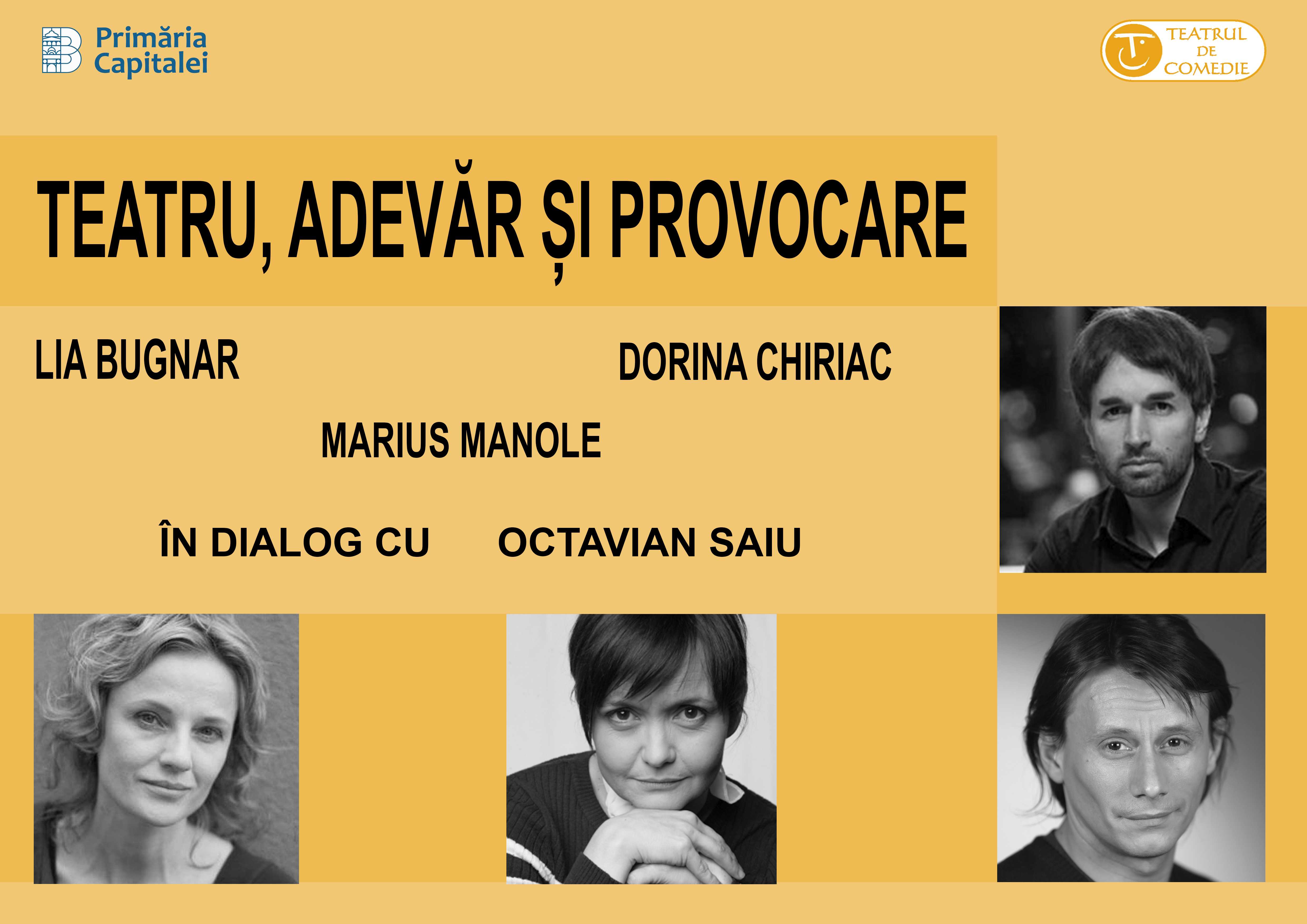 Joi, 19 noiembrie 2020, ora 20.30, pe pagina de facebook a Teatrului de Comedie (TeatruComedie) continuă seria întâlnirilor online, cu o conferință-dialog inedită, intitulată „Teatru, adevăr și provocare”. Întâlnirea online va fi moderată de Octavian Saiu și îi va avea ca invitați pe Lia Bugnar, Dorina Chiriac și Marius Manole. Tema propune un dialog sincer despre criza lumii și a teatrului, o întâlnire despre adevăruri și provocări de toate felurile. Conferința se va transmite în regim de premieră și va putea fi vizionată de publicul larg. Eveniment organizat de Primăria Municipiului București prin Teatrul de Comedie.
