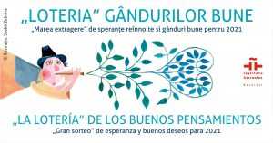 Institutul Cervantes din București lansează, în luna decembrie, campania „Loteria” gândurilor bune. Având subtitlul „Marea extragere” de speranțe reînnoite și gânduri bune pentru 2021, inițiativa își propune să readucă speranța și optimismul în viețile oamenilor. La finalul unui an atipic, care ne regăsește pe cei mai mulți dintre noi speriați, obosiți, dar și nerăbdători să ne întoarcem la viețile noastre, echipa Institutului Cervantes consideră că este nevoie, mai mult ca niciodată, de întărirea legăturilor cu toți cei care, de 25 de ani neîntrerupți, urmăresc activitatea cunoscutei instituții din Bulevardul Elisabeta nr. 38.