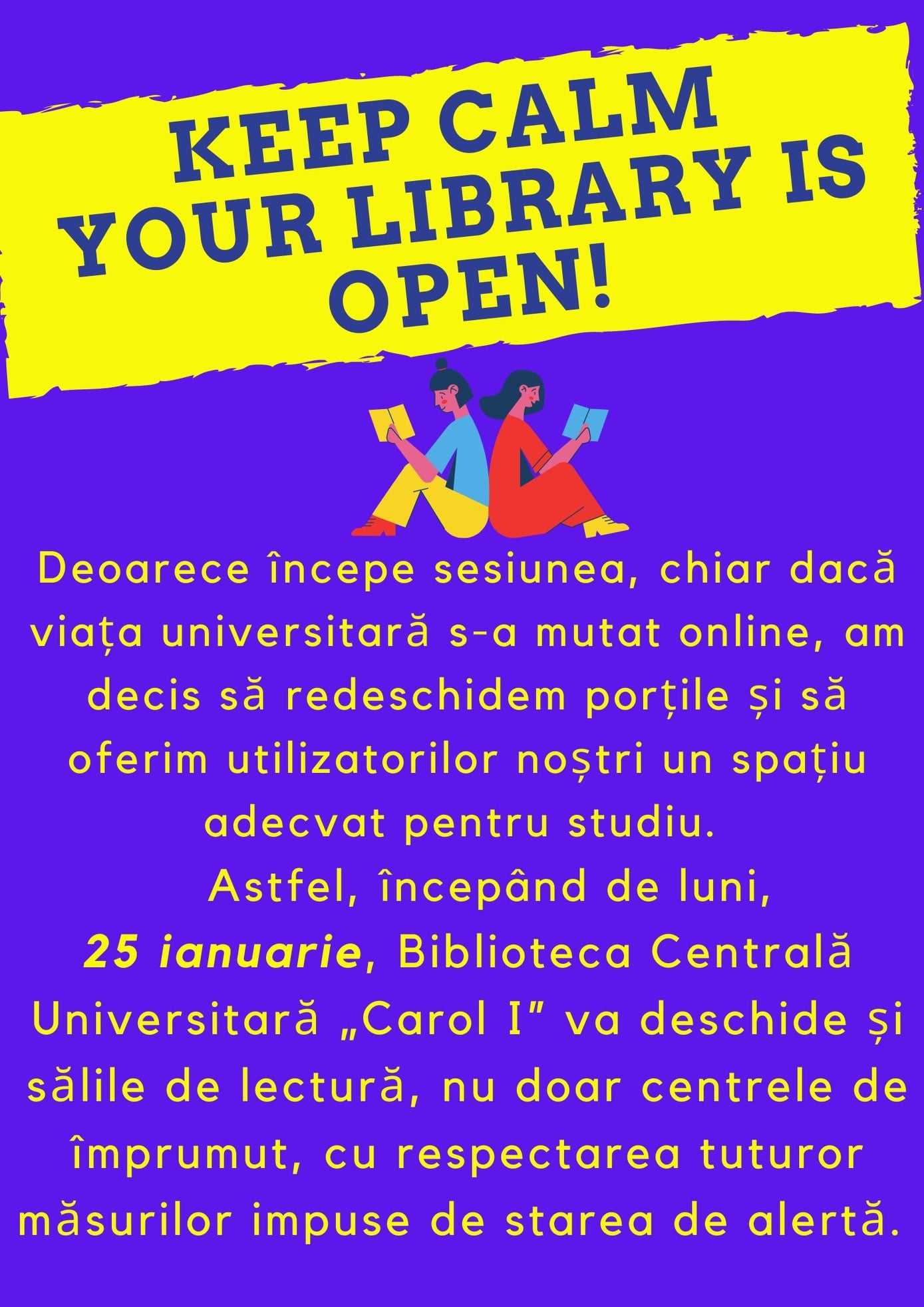 Luni, 25 ianuarie 2021, începând cu ora 10.00, Biblioteca Centrală Universitară ”Carol I” din București își redeschide sălile de lectură, oferind, astfel, un instrument de cercetare, documentare și de studiu pentru studenții care se pregătesc pentru sesiunea de iarnă, dar și pentru toți cercetătorii mediului academic. ”Deoarece începe sesiunea, chiar dacă viața universitară s-a mutat online, am decis să redeschidem porțile și să oferim utilizatorilor noștri un spațiu adecvat pentru studiu. Astfel, începând de luni, 25 ianuarie, Biblioteca Centrală Universitară ”Carol I” va deschide și sălile de lectură, nu doar centrele de împrumut, cu respectarea tuturor măsurilor impuse de starea de alertă.”, se arată într-o postare pe pagina web a Bibliotecii Centrale Universitare ”Carol I” din București, instituție coordonată de conf.univ.dr. Mireille Rădoi. Programul Unității Centrale (intrarea din Corp Boema, str. C. A. Rosetti, nr. 2-6) este între orele 10:00-18:00, iar cel al Centrului de Împrumut al Secției Pedagogice „I.C. Petrescu” este între orele 10:00 -18:00.