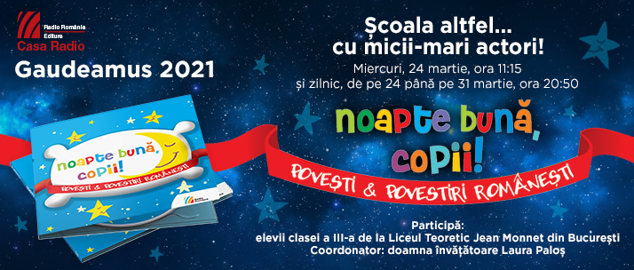 Atelierul de creație va fi transmis pe site-ul gaudeamus.ro și pe paginile oficiale de Facebook Gaudeamus Radio România și Editura Casa Radio, miercuri, 24 martie, de la ora 11.15, iar rezultatul său – interpretările micilor actori – le veți putea urmări în fiecare seară, de pe 24 pe 31 martie, de la ora 20.50, sub titlul Noapte bună, copii!, pe site-ul gaudeamus.ro și pe paginile oficiale de Facebook Gaudeamus Radio România, Editura Casa Radio și Radio România (selecție).