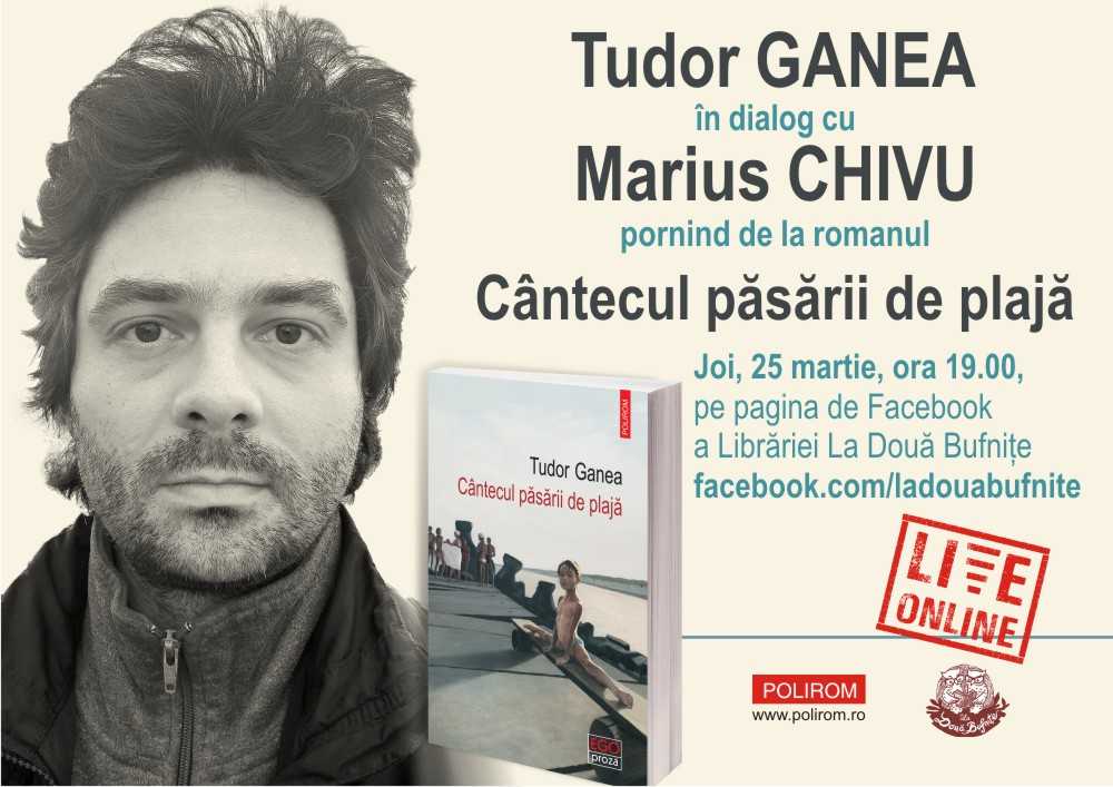 Joi, 25 martie 2021, la ora 19.00, pe pagina de Facebook a Librăriei La Două Bufnițe, va avea loc lansarea romanului Cântecul păsării de plajă de Tudor Ganea, apărut de curînd în colecția „Ego. Proză” a Editurii Polirom. Despre carte vor vorbi autorul și criticul literar Marius Chivu.