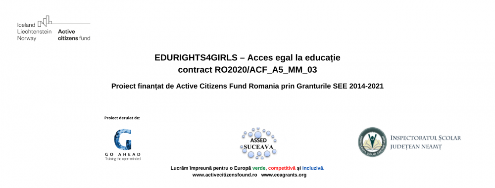 Proiectul este implementat de către Asociația GO-AHEAD București, în parteneriat cu Inspectoratul Școlar Județean Neamț și Asociația Școlară Suceveană pentru Educație si Dezvoltare, cu sprijinul financiar Active Citizens Fund România, program finanțat de Islanda, Liechtenstein și Norvegia prin Granturile SEE 2014-2021.