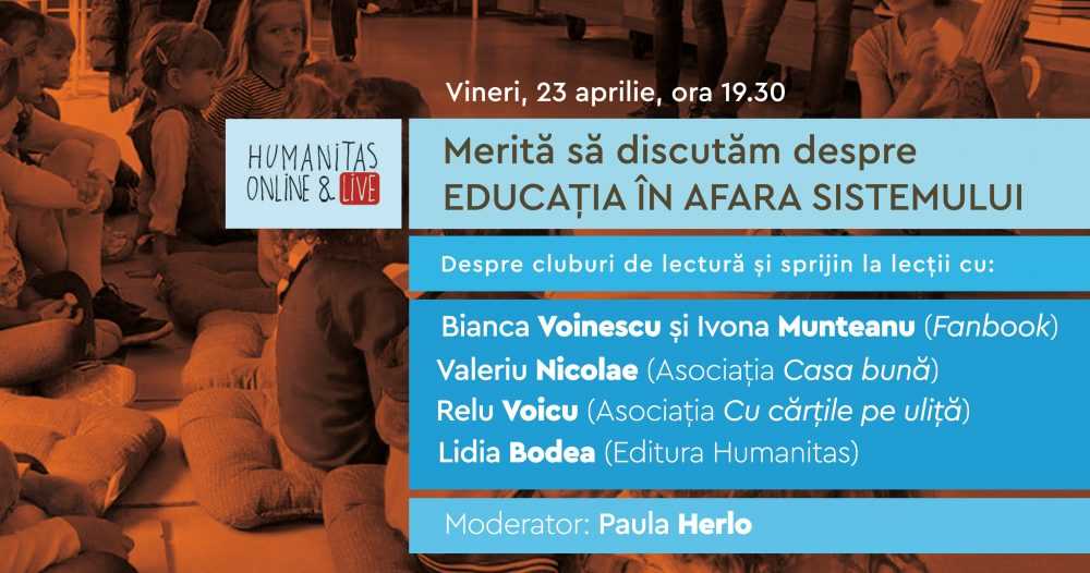 Vineri, 23 aprilie 2021, la ora 19.30, Editura Humanitas vă invită la a doua ediție a întâlnirilor „Merită să discutăm despre”. Vom avea de această dată un dialog cu oameni care au o experiență lungă în a crea ocazii în care copiii și adolescenții să se poată exprima, să aibă acces la cărți și lectură, la explicații în plus și ajutor la lecții. Vom afla ce au observat în contactul lor cu copii din medii diferite, de vârste diferite, cu părinți și școli. Și de ce a fost important pentru copiii și adolescenții cu care s-au întâlnit constant și pe care i-au putut vedea evoluând ca activitatea lor să continue.