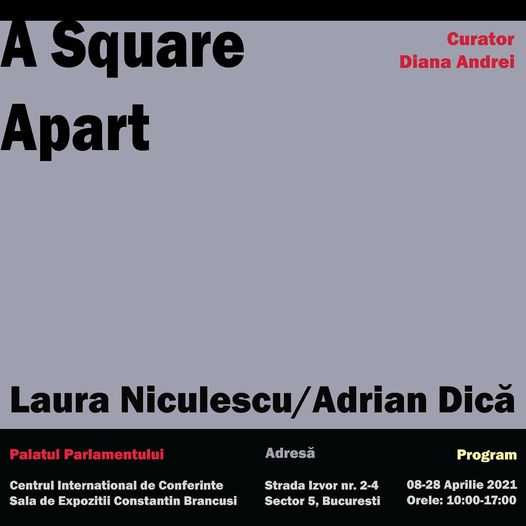 Joi, 8 aprilie 2021, între orele 10:00 -17:00, la Sala de Expoziții Constantin Brâncuși din incinta Palatului Parlamentului (Centrul Internațional de Conferințe, Str. Izvor, Nr. 2-4, Sector 5, București) are loc deschiderea expoziției „A SQUARE APART | UN PĂTRAT DISTANȚĂ” a artiștilor Laura Niculescu și Adrian Dică. Curatoriată de Diana Andrei, expoziția poate fi vizitată în perioada 8 – 28 aprilie 2021, de luni până vineri în intervalul orar 10:00 – 17:00.