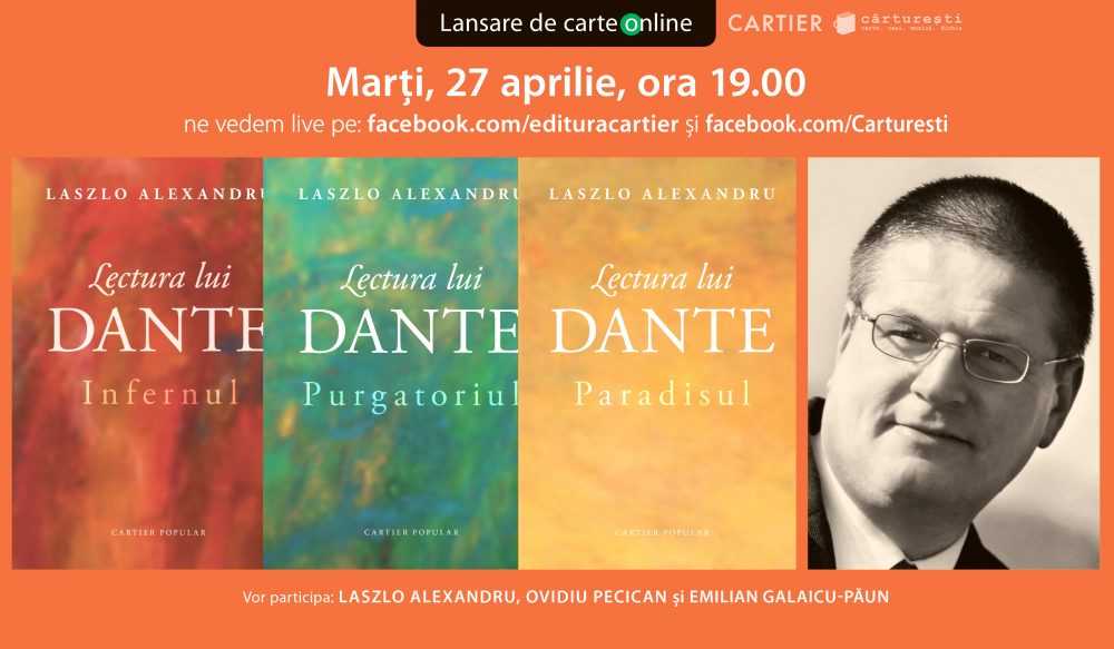 Marți, 27 aprilie 2021, ora 19.00, va avea loc lansarea online a volumulelor Lectura lui Dante, de Laszlo Alexandru, apărute la Editura Cartier. Vor participa : Laszlo Alexandru, Ovidiu Pecican și Emilian Galaicu-Păun. Discuția va fi transmisă live, pe pagina facebook a Editurii Cartier și pe pagina Librăriilor Cărturești. Înregistrare disponibilă ulterior și pe canalul Editurii Cartier de pe YouTube. Evenimentul este organizat de către Editura Cartier în colaborare cu Librăriile Cărturești.