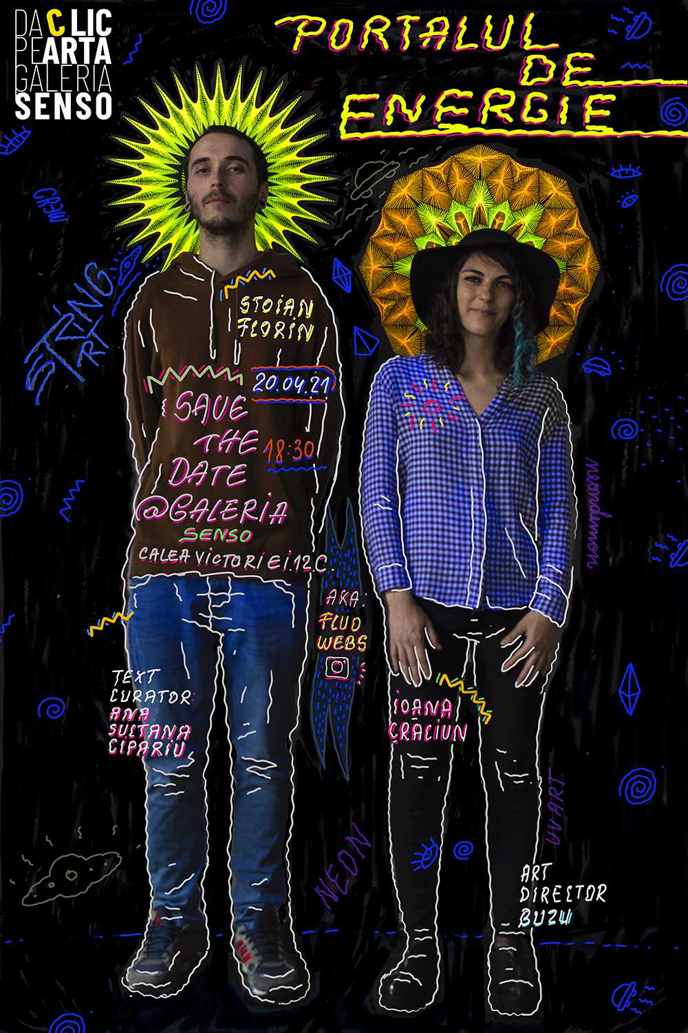 Marţi, 20 aprilie 2021, începând cu ora 18:30, se deschide, la Galeria Senso (Calea Victoriei nr. 12C), expoziţia de string art fluorescent „Portalul de energie” a duoului artistic Fluo Webs. Însoțită de un text curatorial semnat de Ana Sultana Cipariu, expoziţia face parte din programul expozițional propus de Ana Ștefania Andronic (BUZU), noul Director Artistic al spațiului expozițional şi poate fi vizitată în perioada 15-30 aprilie 2021.