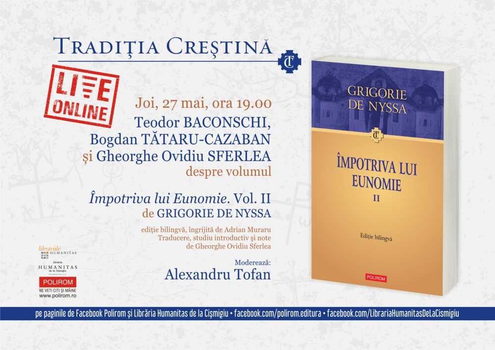 Joi, 27 mai 2021, la ora 19.00, pe paginile de Facebook Polirom și Librăria Humanitas de la Cișmigiu, va avea loc lansarea celei mai recente apariții din prestigioasa colecție „Tradiția creștină” a Editurii Polirom: Împotriva lui Eunomie. Vol. II de Grigorie de Nyssa, ediție bilingvă, îngrijită de Adrian Muraru; traducere, studiu introductiv şi note de Gheorghe Ovidiu Sferlea. Vor vorbi: Teodor Baconschi, Bogdan Tătaru-Cazaban și Gheorghe Ovidiu Sferlea. Va modera: Alexandru Tofan.