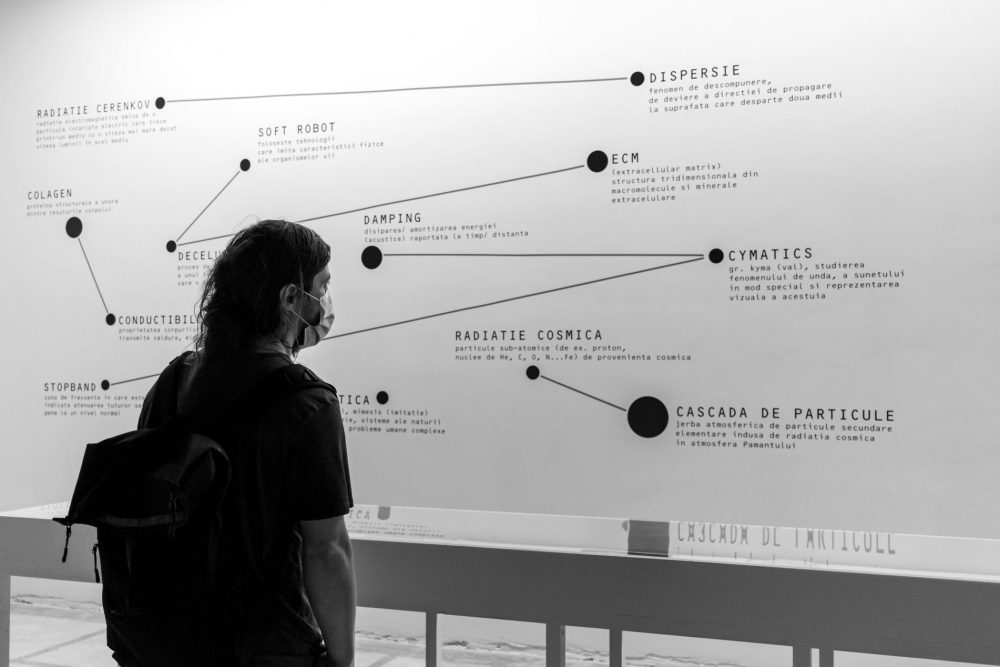 / Lucrarea din cadrul expoziției – Arheologia invizibilului – ecouri din Universul îndepărtat: instalație multimedia care vorbește în cheie poetică despre modalități posibile de reprezentare a interacțiunii particulelor de energie înaltă cu atmosfera terestră