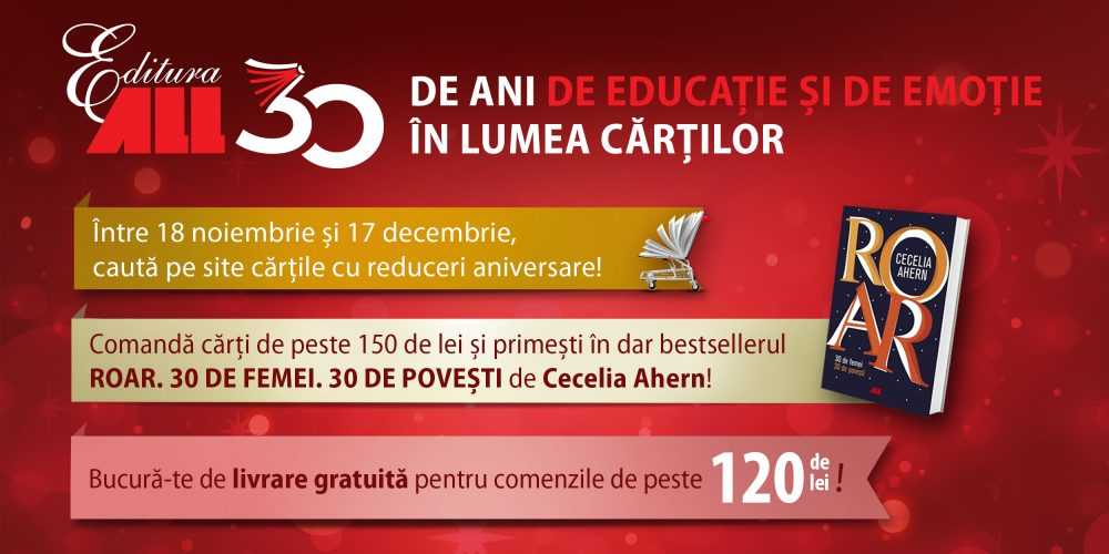 Pentru a rememora momente-cheie ale acestui parcurs îndelungat, nu de puține ori marcat de provocările inerente industriei de carte autohtone, am adunat mărturii și urări emoționante de la autori și traducători, parteneri de afaceri și colaboratori, foști și actuali angajați, oameni dragi care ne-au fost alături în această călătorie, pe care le vom publica zilnic pe pagina oficială de Facebook a editurii. De asemenea, din 18 noiembrie, vizitatorii site-ului nostru vor găsi secțiunea „Oferta zilei ALL 30”, în care adăugăm zilnic cele mai populare titluri cu 50% reducere. Orice comandă de peste 150 de lei pe www.all.ro va fi însoțită de un cadou special – bestsellerul ROAR. 30 de femei. 30 de povești, semnat de scriitoarea irlandeză Cecelia Ahern, o carte despre esența fragilă, dar durabilă și perseverentă a naturii umane, cu al cărei mesaj ne identificăm acum, în momentul bilanțului.