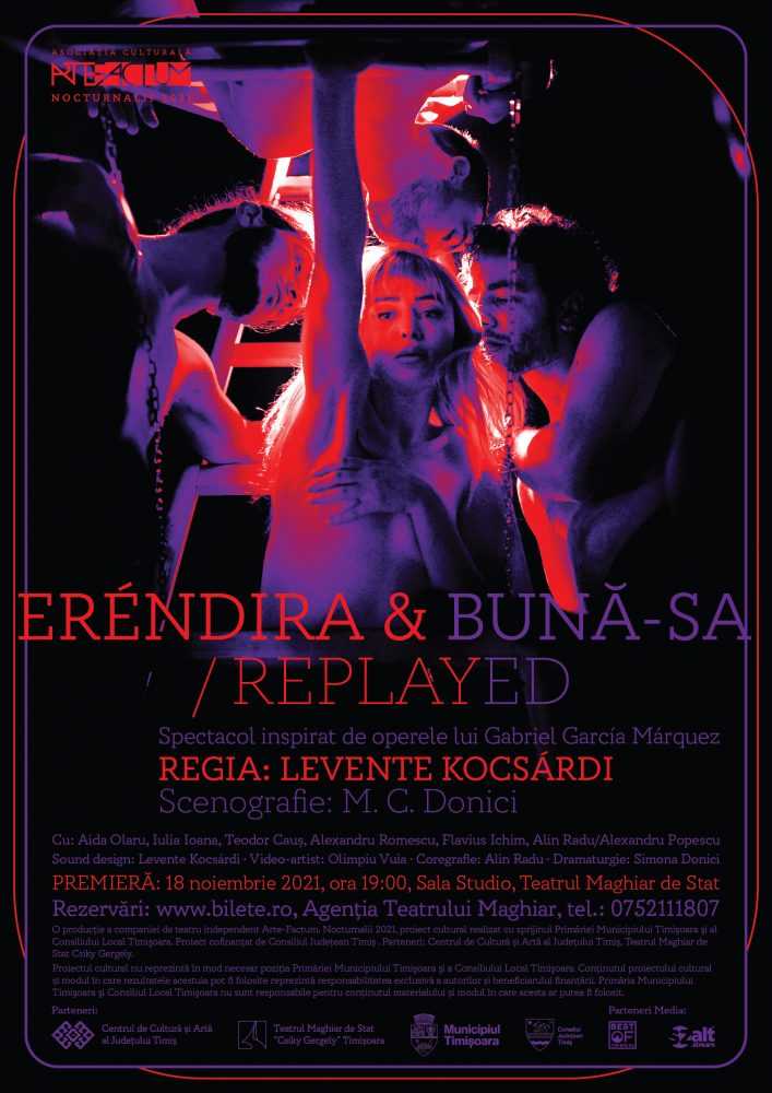 ”Eréndira&bună-sa/replayed”, spectacol al companiei Arte-Factum, va avea premiera în cadrul stagiunii independente Nocturnalii, joi, 18 noiembrie 2021, de la ora 19, în sala Studio a Teatrului Maghiar din Timișoara. Spectacolul este rezultatul celui mai recent Laborator de introspecție teatrală al regizorului Kocsárdi Levente, inspirat de opera scriitorului Gabriel García Márquez.