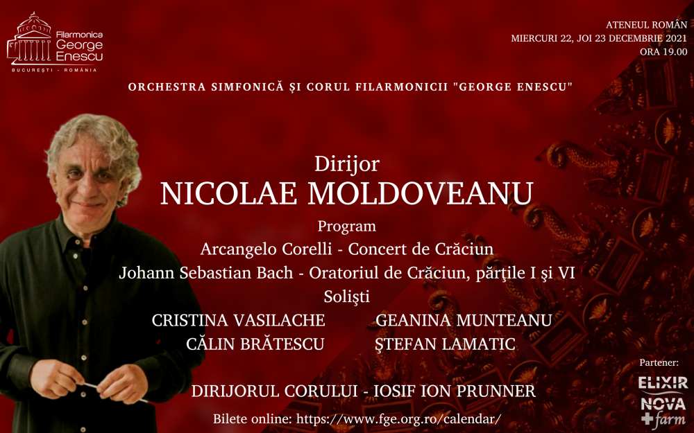 Miercuri, 22 și joi, 23 decembrie 2021, Orchestra simfonică a Filarmonicii „George Enescu” va fi condusă de dirijorul Nicolae Moldoveanu, în două concerte cu public, susținute de la ora 19.00, în Sala mare a Ateneului Român. Programul va cuprinde Concert de Crăciun de Arcangelo Corelli și Oratoriul de Crăciun, părţile I şi VI, de Johann Sebastian Bach. Arcangelo Corelli și Johann Sebastian Bach au semnat în secolele XVII şi XVIII unele dintre cele mai faimoase lucrări de Crăciun, opusuri care nu lipsesc nici astăzi din repertoriul tradiţional al sărbătorii. Concerto grosso în sol minor, op. 6, nr. 8 de Arcangelo Corelli, mai cunoscut sub numele de Concertul de Crăciun, a fost comandat de cardinalul Pietro Ottoboni și publicat postum în 1714. Concertul, scris pentru două viori și violoncel, poartă mottoul Fatto per la note de Natale ( Pentru Noaptea de Crăciun).