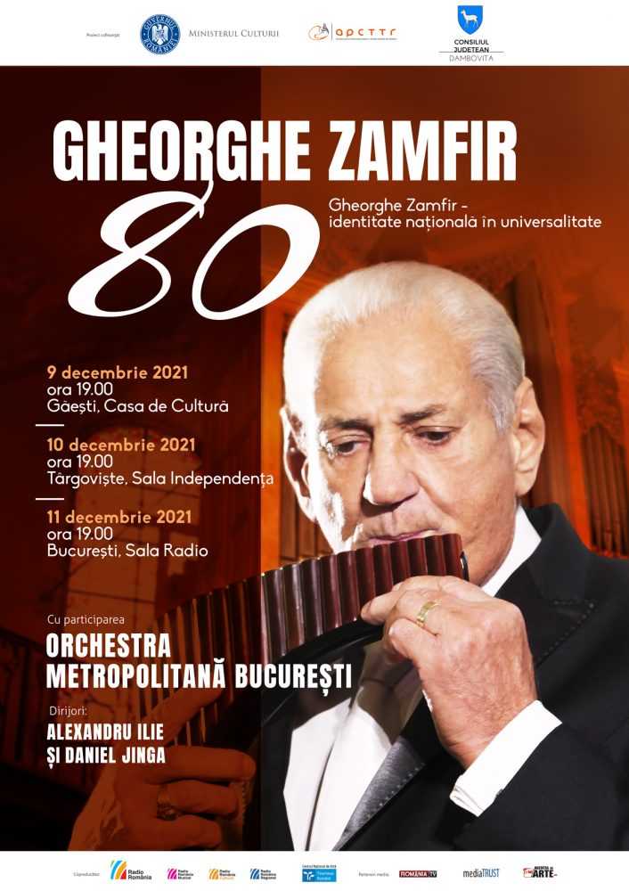 Evenimentul ”Gheorghe Zamfir – 80” invită publicul din România la o întâlnire inedită cu legendarul naist Gheorghe Zamfir, în trei concerte ce vor avea loc între 9 şi 11 decembrie 2021 la Găeşti – localitatea natală a artistului – pe 9 decembrie, de la ora 19, la Casa de cultură, la Târgovişte, pe 10 decembrie, de la ora 19, la Sala Independenţa, şi la Bucureşti pe 11 decembrie, de la ora 19, la Sala Radio. Proiectul Gheorghe Zamfir – identitate națională în universalitate, realizat cu cofinanţarea Ministerului Culturii de Asociaţia pentru Promovarea Copiilor şi Tinerilor Talentaţi din România şi beneficiind de sprijinul Consiliului Judeţean Dâmboviţa, coproducător Radio România își propune promovarea în plan național și internațional a excelenței actului intrepretativ generat de personalitatea muzicală complexă a maestrului Gheorghe Zamfir, în contextul împlinirii, anul acesta, a 80 de ani de la naștere. AgențiadecArte.ro este partener media al evenimentului.