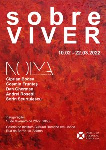 Galeria Institutului Cultural Român de la Lisabona (Rua de Barão 10, Alfama) găzduiește, în perioada 10 februarie – 22 martie 2022, expoziţia colectivă ”s o b r e V I V E R” (Asupra Viețuirii), curatoriată de pictorul Andrei Rosetti. Expoziția conține lucrări de pictură, desen, fotografie, obiect, performance, video ale grupului de artiști români contemporani NOIMA, fondat în 2003 și format din Ciprian Bodea, Dan Gherman, Cosmin Frunteş, Sorin Scurtulescu și Andrei Rosetti. Vernisajul va avea loc în data de 10 februarie, ora 18.30, în prezența artistului Cosmin Frunteş. Izolarea artiștilor din toate domeniile artei în prima jumătate a anului 2020, perioada celor mai severe restricții din timpul pandemiei de Covid-19, a fost în unele cazuri și un prilej al unor noi, inevitabile introspecții, al găsirii unor noi modalități de exprimare. Artiștii vizuali, adesea dependenți de contactul direct (vizual sau chiar tactil) al receptorului cu opera, de vizita efectivă în galeria unde aceasta este expusă, unul din locurile predilecte unde se poate cu adevărat, nemijlocit, interacționa cu lucrarea de artă, au fost poate cei mai afectați de distanțarea socială impusă în cursul anului 2020 și ulterior.