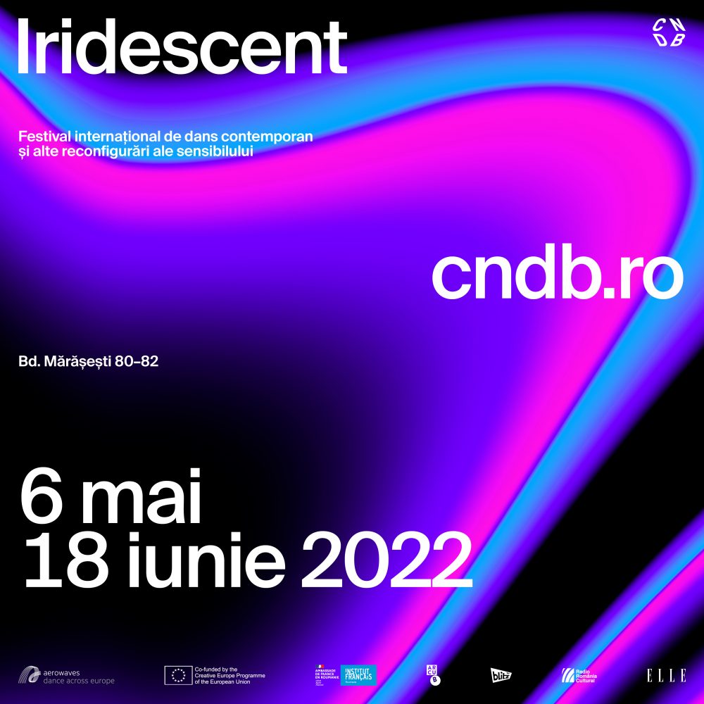 Centrul Național al Dansului București – CNDB – organizează, între 6 mai și 18 iunie 2022, ”Iridescent” – Festival internațional de dans contemporan și alte reconfigurări ale sensibilului. După o pauză de trei ani, CNDB revine cu un festival internațional dedicat dansului contemporan, artelor performative și altor conținuturi și formate, prin care prezintă publicului 10 producții coregrafice invitate din străinătate și din România, ateliere de dans pentru profesioniști, conferințe, cine colective, o sesiune de ascultare sonoră și o serie de DJ sets, o seară de poezie, un concert și un maraton de idei, declarații și mesaje pentru Planeta Pământ, care creează spațiu unor discursuri emancipatoare, și, nu în cele din urmă, aduc bucuria de a continua împreună.