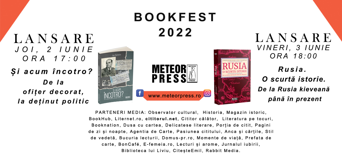 Cu ocazia deschiderii porților unuia dintre cele mai cunoscute festivaluri de carte din România, după trei ani – Bookfest 2022 –, Editura Meteor Press va fi prezentă cu două lansări cu tematică de mare actualitate, cu o promoție irezistibilă și gânduri frumoase pentru toți cititorii săi.