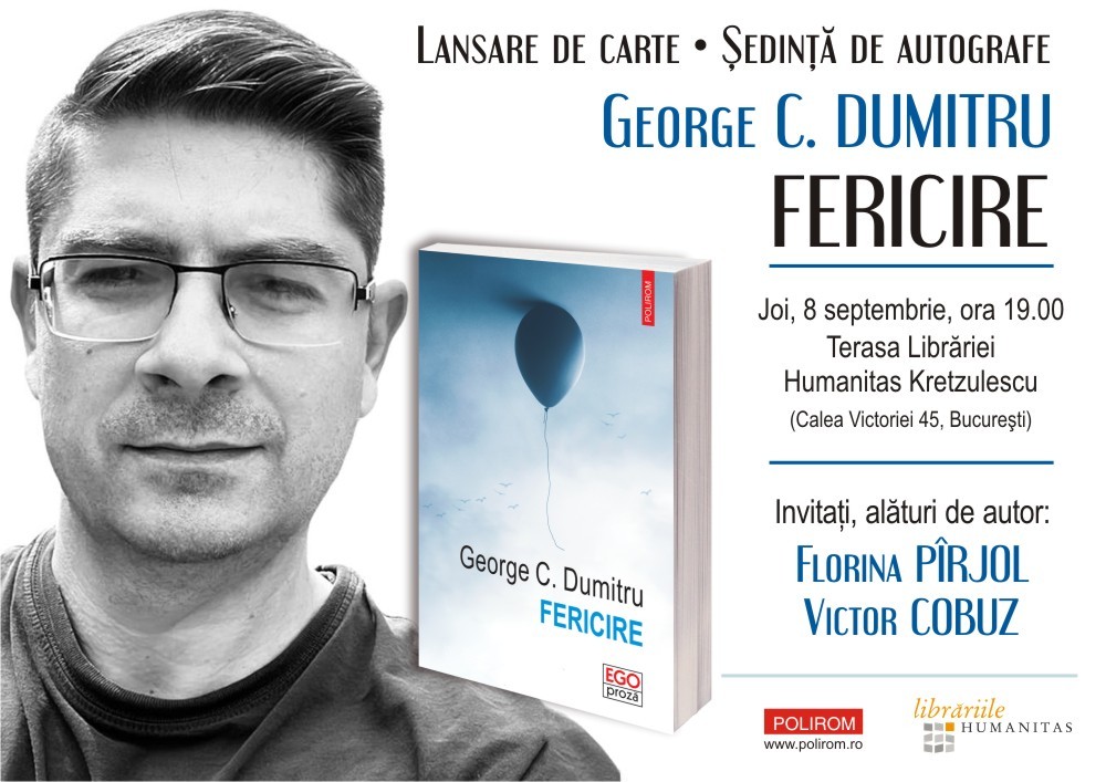 Editura Polirom vă așteaptă joi, 8 septembrie 2022, începând cu ora 19.00, pe terasa Librăriei Humanitas Kretzulescu (Calea Victoriei 45, Bucureşti), la o întâlnire cu George C. Dumitru și noul său volum, ”Fericire”, apărut de curând în colecția Ego. Proză. Alături de autor, vor vorbi despre carte Florina Pîrjol și Victor Cobuz. Discuția va fi urmată de o ședință de autografe.