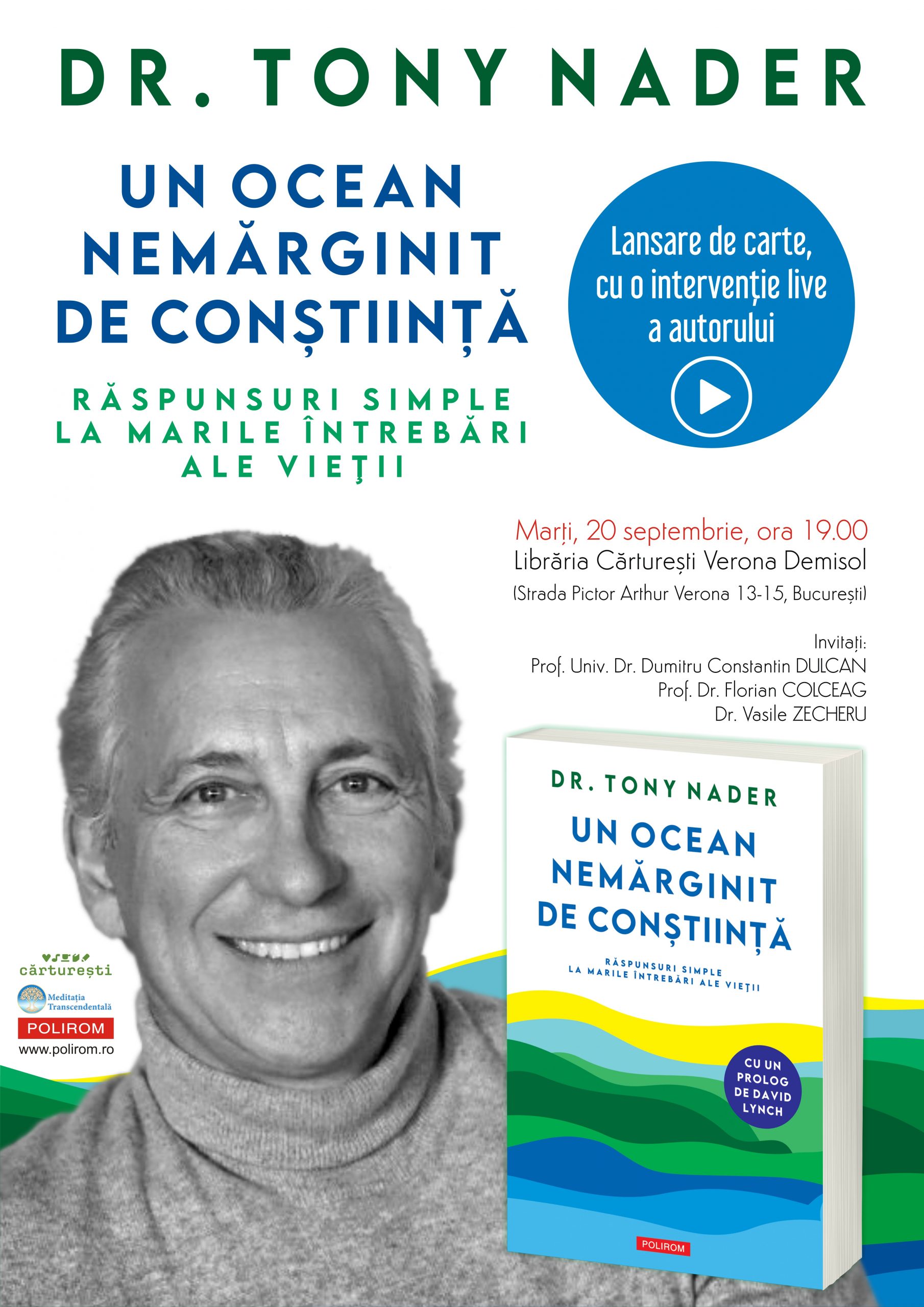 Marți, 20 septembrie 2022, ora 19.00, la Librăria Cărtureşti Verona Demisol (Str. Pictor Arthur Verona 13-15, Bucureşti), va avea loc lansarea volumului ”Un ocean nemărginit de Conștiință. Răspunsuri simple la marile întrebări ale vieții” de Dr. Tony Nader, publicat de curând la Editura Polirom, în colecția Hexagon. Dr. Tony Nader va participa la eveniment LIVE via zoom și va intra în dialog cu publicul.