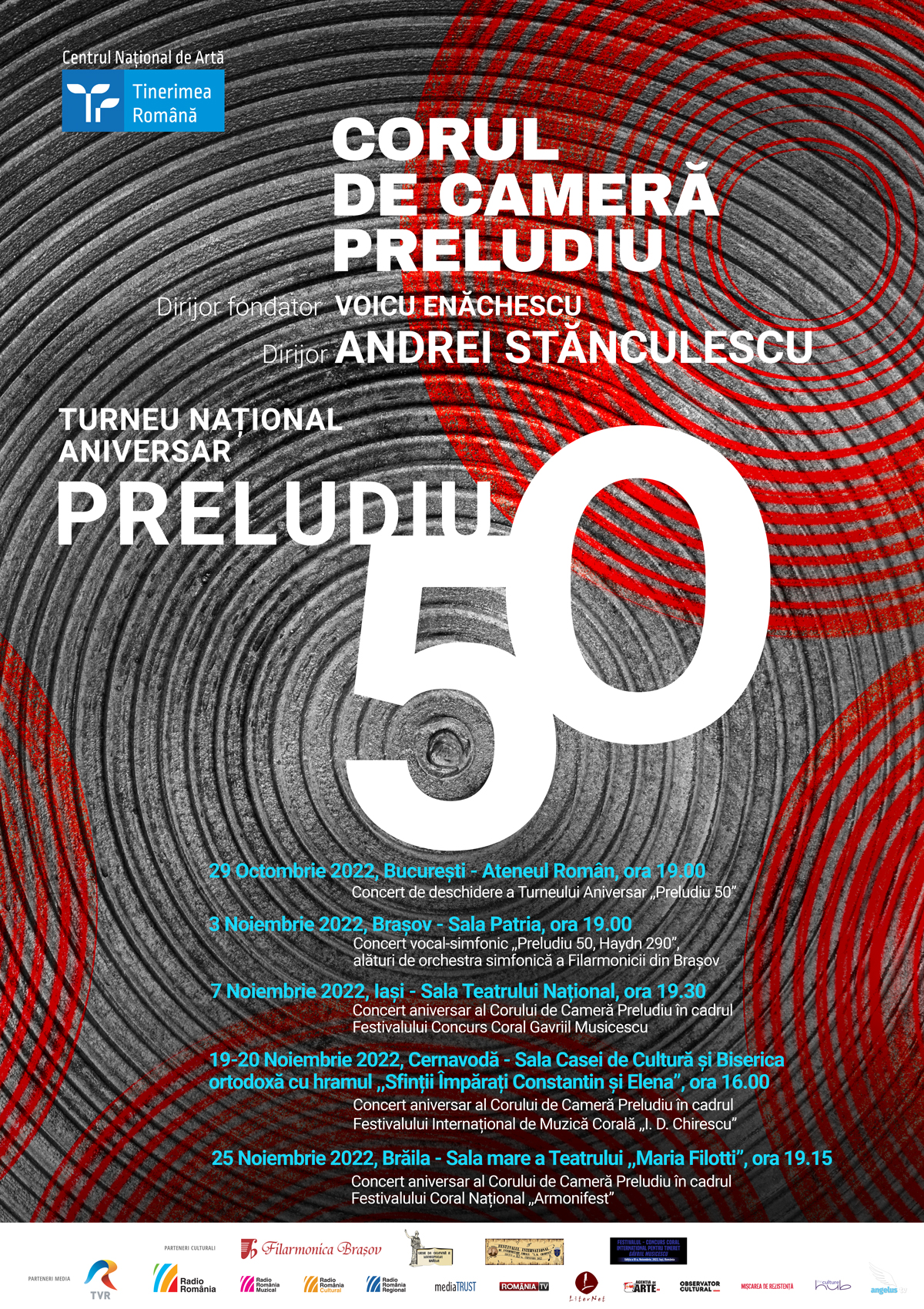 După succesul de la concertul inaugural din 29 octombrie de la Ateneul Român, turneul naţional aniversare al Corul de cameră ”Preludiu” al Centrului Naţional de Artă Tinerimea Română condus de Andrei Stănculescu, continua cu două concerte la Brașov (3 noiembrie, Sala Patria, ora 19.00, alături de Orchestra Simfonică a Filarmonicii din Braşov – Concert vocal-simfonic “Preludiu – 50, Haydn – 290” ) și Iași (7 noiembrie, Sala Teatrului Național, în cadrul Festivalului Concurs “Gavriil Musicescu”, ora 19.30), publicul din întreaga ţară putând asculta această corală cu o activitate atât de importantă în viaţa muzicală românească. Turneul se va încheia cu alte două concerte, programate pe 19-20 noiembrie la Cernavodă, în Sala Casei de Cultură și Biserica ortodoxă cu hramul ,,Sfinții Împărați Constantin și Elena”, Concert aniversar al Corului de Cameră Preludiu în cadrul Festivalului Internațional de Muzică Corală “I.D.Chirescu” şi pe 25 noiembrie la Brăila – Sala mare a Teatrului ,,Maria Filotti” ora 19.15 Concert aniversar al Corului de Cameră Preludiu în cadrul Festivalului Coral Național ,,Armonifest”. AgențiadecArte.ro este partner media al evenimentului.