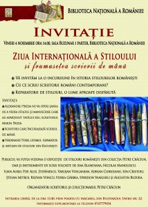 Puțini știu că în prima zi de vineri a lunii noiembrie se aniversează – din 2012 – Ziua Internațională a stiloului. Este o inițiativă menită să mențină viu interesul pentru acest minunat instrument de scris, dar și pentru scrisul de mână, în general.Iată de ce, în colaborare cu Biblioteca Națională a României, personal cu directorul acesteia, istoricul Adrian Cioroianu, vă propun ca această zi să fie marcată și la noi printr-un eveniment plin de semnificații.Așa se face că vineri, 4 noiembrie, la ora 14.00, sunteți invitați la Biblioteca Națională a României din București, Bulevardul Unirii nr. 22, pentru a participa la evenimentul ”Ziua Internațională a stiloului. Frumusețea scrierii de mână”.