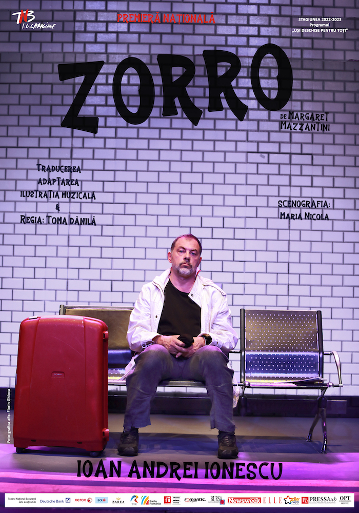 Teatrul Naţional I.L.Caragiale anunţă premiera unui nou spectacol în cadrul programului „Uşi deschise pentru toţi”, ”Zorro” de Margaret Mazzantini, un text tradus şi prezentat în Premieră Naţională. One-man show al actorului Ioan Andrei Ionescu, regizat de Toma Dănilă, noul spectacol de la Sala Pictura va avea premiera în data de 11 decembrie 2022, de la ora 20.00. Publicul este invitat încă din data de 4 decembrie, la avanpremiera spectacolului, să descopere, în decorul semnat de Mara Nicola, una dintre cele mai emoţionante poveşti contemporane, despre felul imprevizibil, cu mai multe feţe, prin care destinul ne poate juca feste şi viaţa ni se poate schimba pe negândite. Cum poate deveni un om bun şi victimă şi călău în acelaşi timp, atunci când toate lucrurile din viaţa lui o iau razna şi nu se mai poate baza pe nimic din ceea ce până atunci însemna obişnuiţă, siguranţă...
