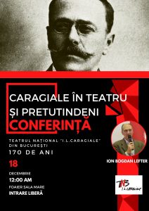 În luna în care Teatrul Național I.L. Caragiale din București marchează 170 de ani de la fondare, cunoscut iniţial ca „Teatrul cel Mare”, în anul în care s-au împlinit 170 de ani de la nașterea lui Ion Luca Caragiale și 110 de la moartea sa, duminică 18 decembrie 2022, de la ora 12.00, va avea loc o conferinţă susţinută de scriitorul, criticul și istoricul literar, profesor la Facultatea de Litere a Universității din București, Ion Bogdan Lefter, cu titlul ”Caragiale în teatru și pretutindeni”.