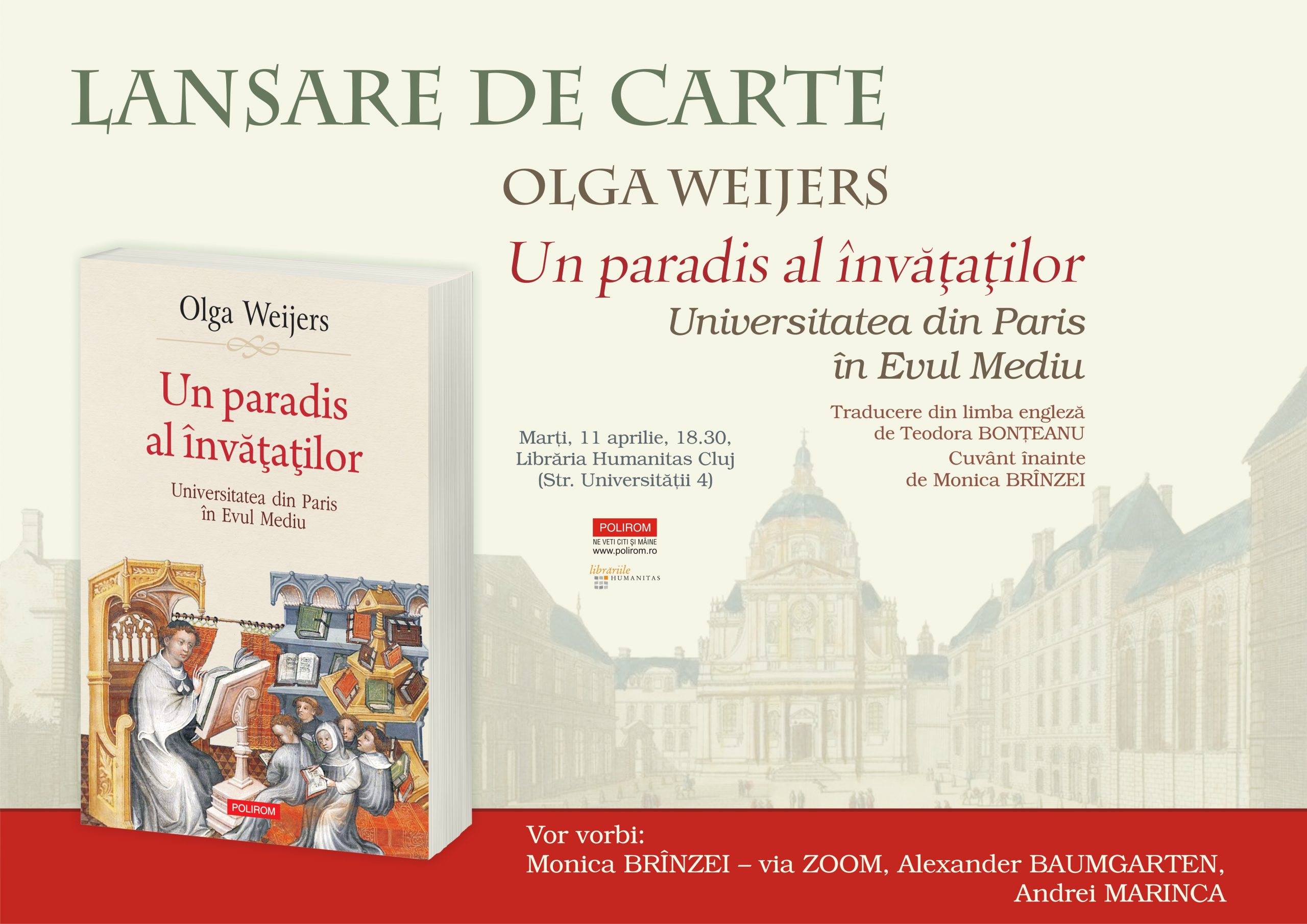 Marți, 11 aprilie 2023, de la ora 18.30, la Librăria Humanitas Cluj (Str. Universității 4) va avea loc lansarea volumului ”Un paradis al învăţaţilor. Universitatea din Paris în Evul Mediu”, Editura Polirom, 2022, traducere din limba engleză de Teodora Bonţeanu. Cuvânt înainte de Monica Brînzei. Vor vorbi: Monica Brînzei – via ZOOM, Alexander Baumgarten, Andrei Marinca.