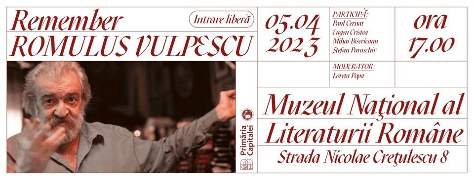 Muzeul Național al Literaturii Române vă propune un eveniment dedicat memoriei celui care a fost Romulus Vulpescu, poet, scriitor, editor, publicist, politician și traducător român, care va avea loc miercuri, 5 aprilie 2023, ora 17.00, în Sala Perpessicius din Str. Nicolae Crețulescu nr. 8 (în spatele Bisericii Albe). Invitați: criticul literar Paul Cernat, actorii Eugen Cristea și Mihai Bisericanu, Ștefan Paraschiv. Moderator: Loreta Popa