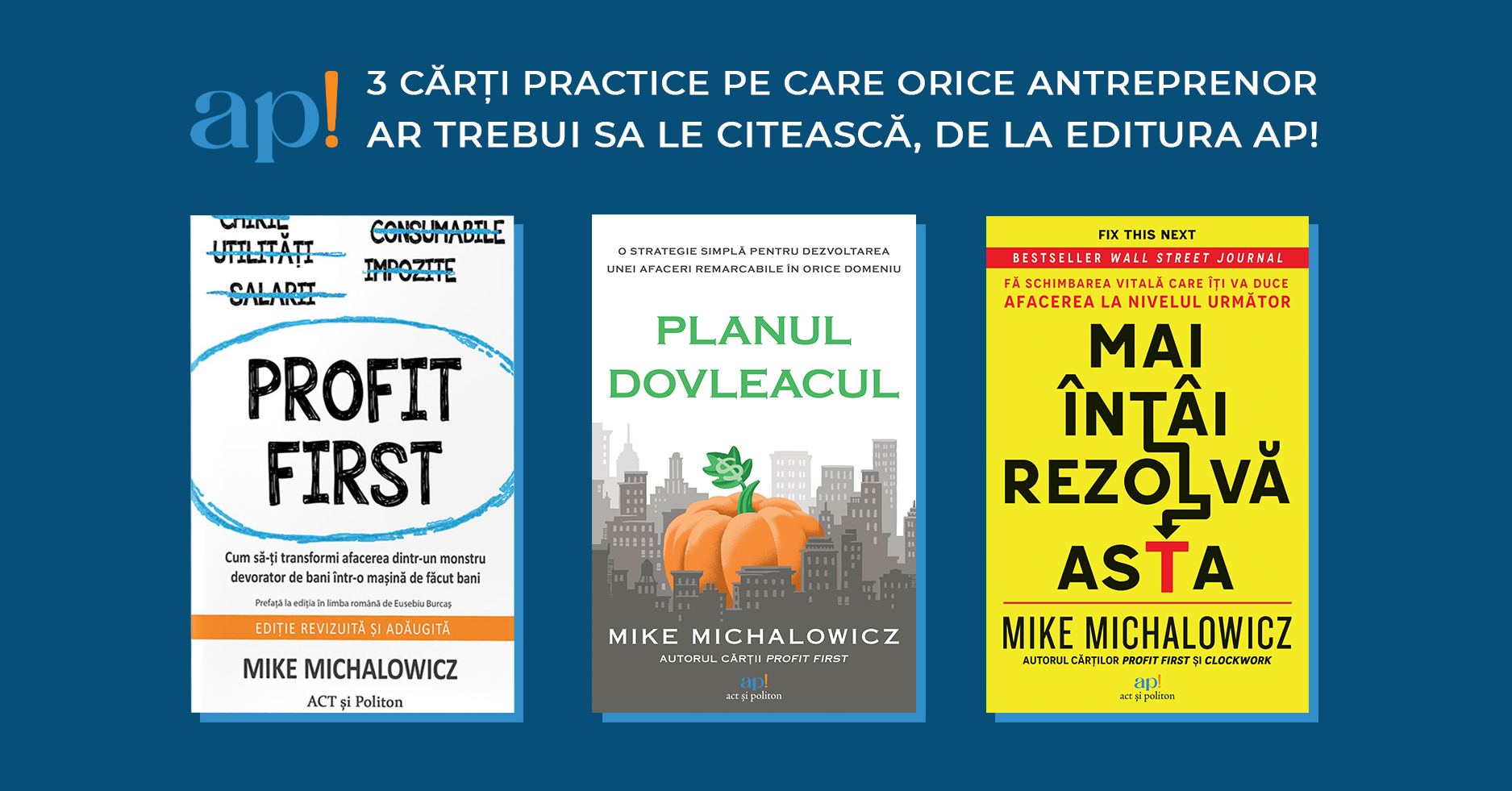 Fiecare antreprenor se confruntă cu provocări pe toate planurile într-o afacere. Unele dintre principalele surse ale problemelor sunt lipsa de experiență, lipsa de resurse sau de finanțare, sau faptul că antreprenorii nici măcar nu știu care este cea mai mare problemă a lor. Editura ap! propune trei titluri care vin în sprijinul antreprenorilor și îi ajută să identifice care sunt punctele slabe în compania lor, furnizându-le tehnici și soluții astfel încât să își îmbunătățească rezultatele în afaceri.