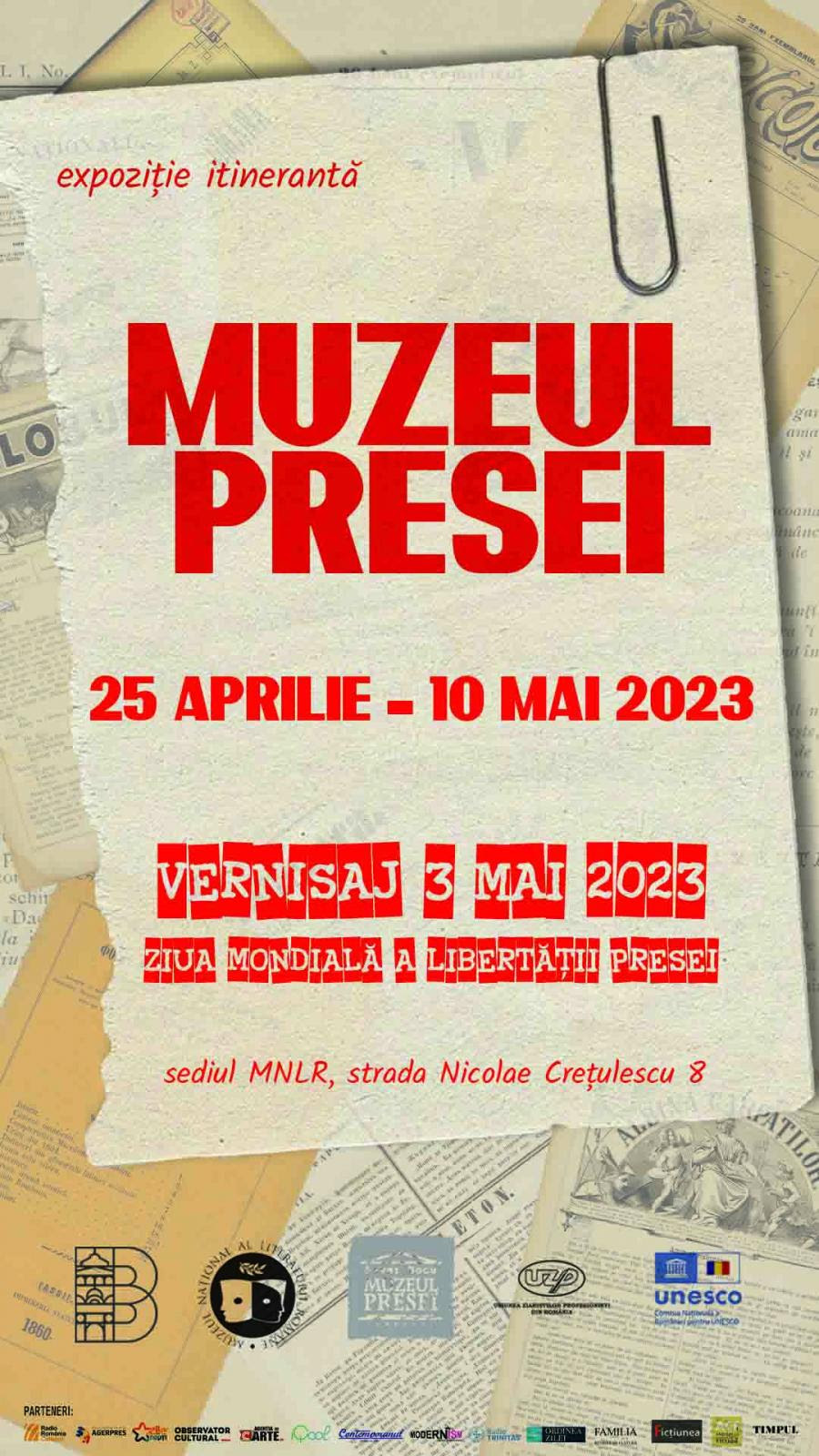 Muzeul Național al Literaturii Române, în parteneriat cu Uniunea Ziariștilor Profesioniști din România, propune publicului o expoziție temporară ce va marca 30 de ani de la inițierea Zilei Mondiale a Libertății Presei. Parteneriatul dintre cele două instituții va deschide, prin această primă expoziție, o serie de evenimente dedicate jurnaliștilor din toate domeniile, un punct de pornire pentru ceea ce se dorește a se clădi în viitor, un Muzeu al Presei Românești. Expoziția este deschisă publicului în perioada 25 aprilie – 10 mai 2023, la sediul Muzeului Național al Literaturii Române din strada Nicolae Crețulescu 8, București, cu un program de vizitare de marți până duminică, în intervalul orar 10:00 – 18:00. În data de 3 mai 2023, ora 17.00, va avea loc vernisajul expoziției, eveniment la care vor participa membri ai MNLR, UZPR și CNR UNESCO. AgențiadecArte.ro este partener media al evenimentului.