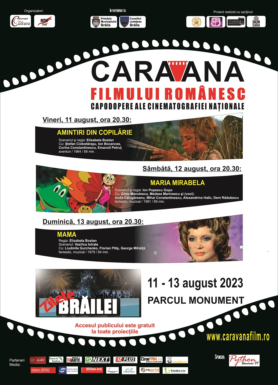 Caravana filmului românesc revine şi în acest an, așa cum ne-a obișnuit din 2015, cu ocazia Zilele Municipiului Brăila, între 11 şi 13 august 2023 în Parcul Monument, cu trei dintre capodoperele cinematografiei naționale, destinate copiilor şi familiilor lor, de fapt, tuturor celor care nu şi-au pierdut lumina sufletului din primii ani de viață.
