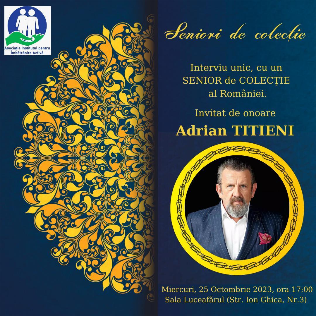 Binecunoscutul actor de teatru și de film, regizor și reputat profesor de Arta Actorului, Președinte de onoare al U.N.A.T.C. ”I.L Caragiale” fost Rector, Doctor în Teatru și actual Manager interimar al Teatrului ODEON, unde joacă din anul 2017, ADRIAN TITIENI este invitatul de onoare al celei de-a XIII-a ediții a a Galei ”SENIORI de COLECȚIE”, un eveniment de excepție organizat de de Asociația Institutul Român pentru Îmbătrânire Activă, condusă de Alexandra Dobre, Președinte.