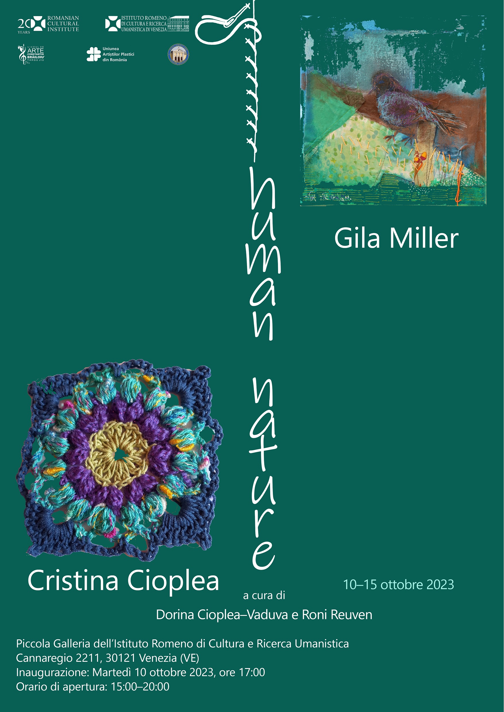 Marți, 10 octombrie 2023, ora 17:00, la Galeria Mică a Institutului Român de Cultură și Cercetare Umanistică din Veneția, va avea loc vernisajul expoziției de artă „Human Nature: Continuing the Conversation”, realizată de Cristina Cioplea (România) și Gila Frost Miller (Israel), curatoriată de Dorina Cioplea-Văduva (România) și Roni Reuven (Israel). Expoziția poate fi vizitată între 10 și 15 octombrie. Program de vizitare: 15.00 – 20.00.