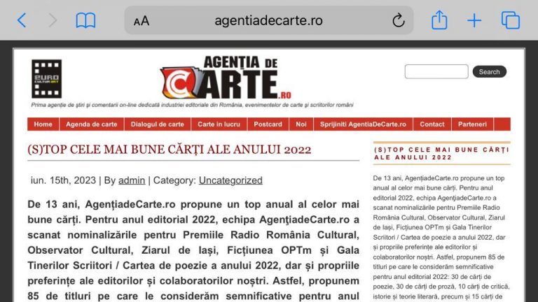 De 13 ani, AgențiadeCarte.ro propune un top anual al celor mai bune cărți. Pentru anul editorial 2022, echipa AgenţiadeCarte.ro a scanat nominalizările pentru Premiile Radio România Cultural, Observator Cultural, Ziarul de Iași, Ficțiunea OPTm și Gala Tinerilor Scriitori / Cartea de poezie a anului 2022, dar și propriile preferințe ale editorilor și colaboratorilor noștri. Astfel, am propus 85 de titluri pe care le-am considerat semnificative pentru anul editorial 2022: 30 de cărți de poezie, 30 de cărți de proză, 10 cărți de critică, istorie și teorie literară, precum și 15 cărți de eseu, publicistică și memorialistică. Cititorii AgenţiadeCarte.ro au putut vota titlurile alese de noi până la 31 august 2023. ”(s)top cele mai bune cărți ale anului 2022” a avut peste 27335 de vizualizări. Premiile sunt finanțate de Ministerul Culturii.