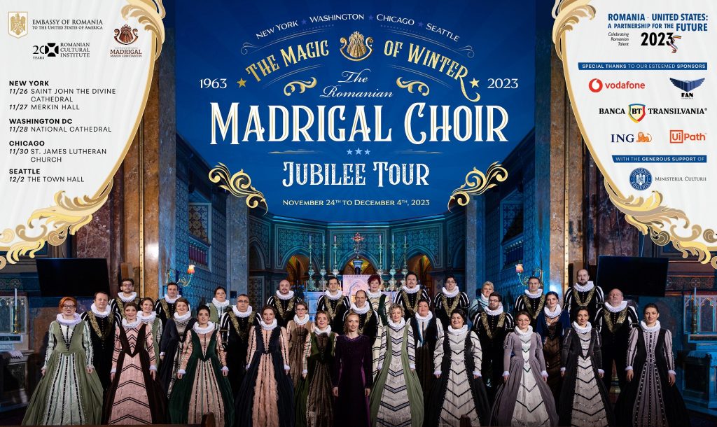 Organizat de Ambasada României în Statele Unite ale Americii împreună cu Institutul Cultural Român de la New York, cu sprijinul generos al Ministerului Culturii și al sponsorilor Banca Transilvania, Vodafone, ING, UiPath și Fan Courier, turneul Corului Madrigal anticipează sărbătorile de iarnă, dar marchează și Ziua Națională a României.