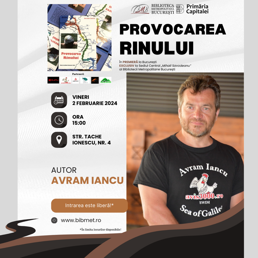 Bibliotecar și sportiv de anduranță, Avram Iancu a decis să își lanseze oficial volumul și în Capitală, alegând, pentru acest eveniment, Biblioteca Metropolitană București. Cartea va fi lansată oficial, la Sediul Central „Mihail Sadoveanu” al Bibliotecii Metropolitane București, din str. Tache Ionescu, nr. 4, vineri 2 Februarie 2024, începând cu ora 15:00.