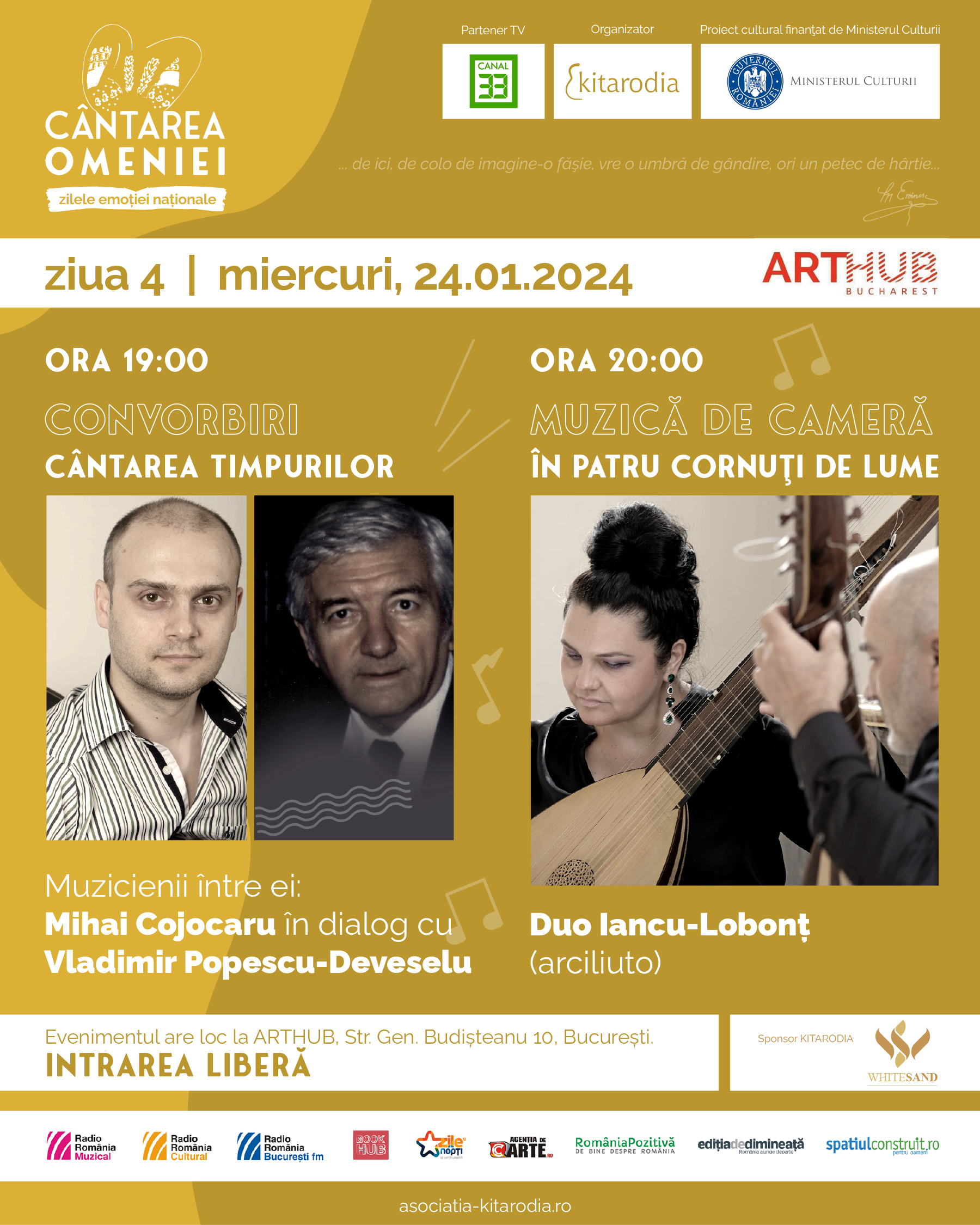 Miercuri 24 ianuarie 2024, la ARTHUB București continuă festivalul eclectic CÂNTAREA OMENIEI. Cea de-a patra seară se deschide cu “Cântarea timpurilor”, o întâlnire spectacol care pune față în față experiența octogenară a unei vieți întregi dedicate muzicii a tenorului Vladimir Popescu-Deveselu și spiritul cultivat și sprinten al mai tânărului său coleg Mihai Cojocaru, chitarist și muzicolog. Publicul va putea vedea cum discută muzicienii între ei, un dialog cu atât mai spumos cu cât ambii invitați sunt adevărate enciclopedii culturale. AgențiadeCarte.ro este partener media al evenimentului.