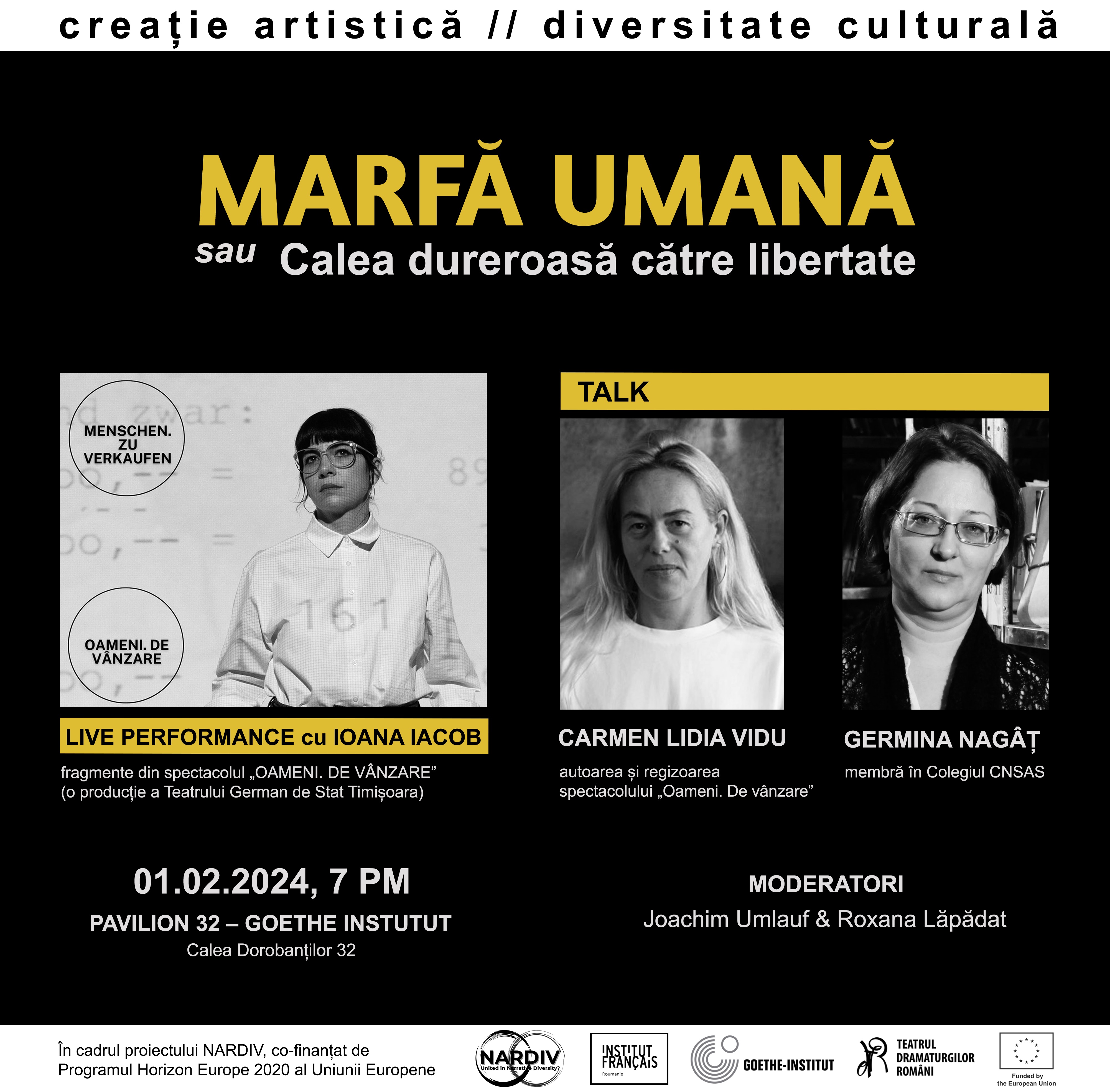 Showcase-ul despre vâzarea etnicilor germani din România comunistă, aflată sub regimul lui Nicolae Ceaușescu – un subiect marcant pentru destinul unei comunități cu o vechime de peste 850 de ani în Transilvania și peste 250 de ani în Banat – va reuni pe 1 februarie, de la ora 19.00, la Pavilion 32 – Goethe-Institut București, un live performance cu actrița Ioana Iacob, cu fragmente din spectacolul-eveniment „Oameni. De vânzare” (o producție a Teatrului German de Stat Timișoara, care a avut premiera în aprilie 2022), precum și o dezbatere cu Carmen Lidia Vidu, autoarea și regizoarea spectacolului, și Germina Nagâț, membră în Colegiul Consiliului Național pentru Studierea Arhivelor Securității (CNSAS). În cadrul discuției vor fi inserate și fragmente video din spectacol, cu interviuri realizate de Carmen Lidia Vidu cu personaje-cheie pentru desfășurarea acestei acțiuni de peste două decenii, precum avocatul Heinz Günther Hüsch, negociatorul din partea RFG, care a murit în octombrie 2023. Dezbaterea va fi moderată de Joachim Umlauf, directorul Goethe-Institut București, și Roxana Lăpădat.